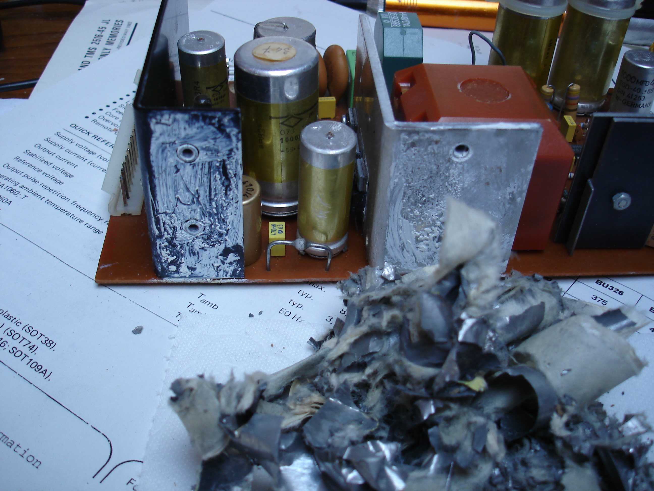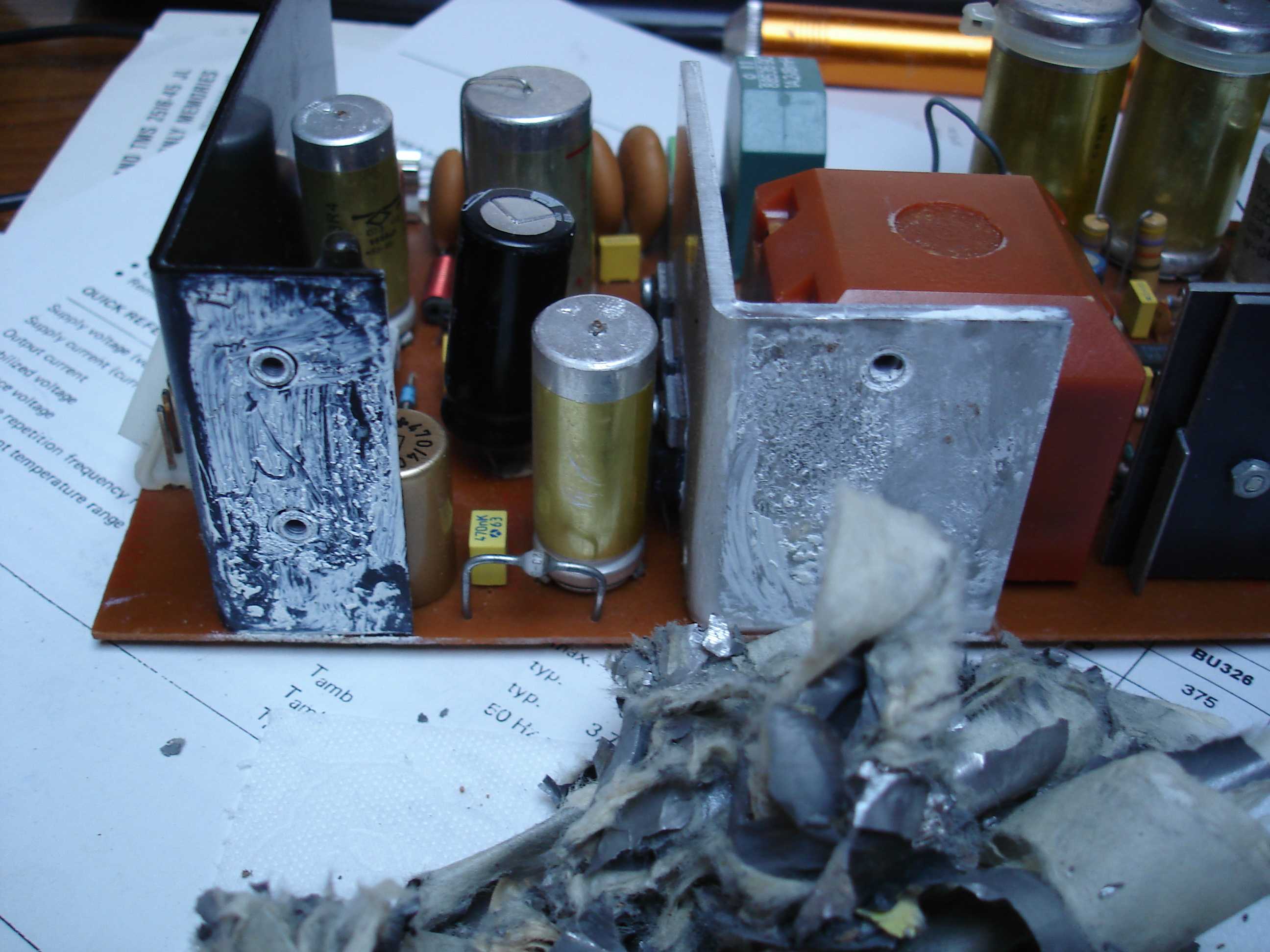 Et hop... un condo fuiteux ! Et de deux avec une belle série de soudures bien fatiguée. Bon, ça c'est fait... tout le reste à l'air normal, tous les transistors et diodes sont testés et sont OK.