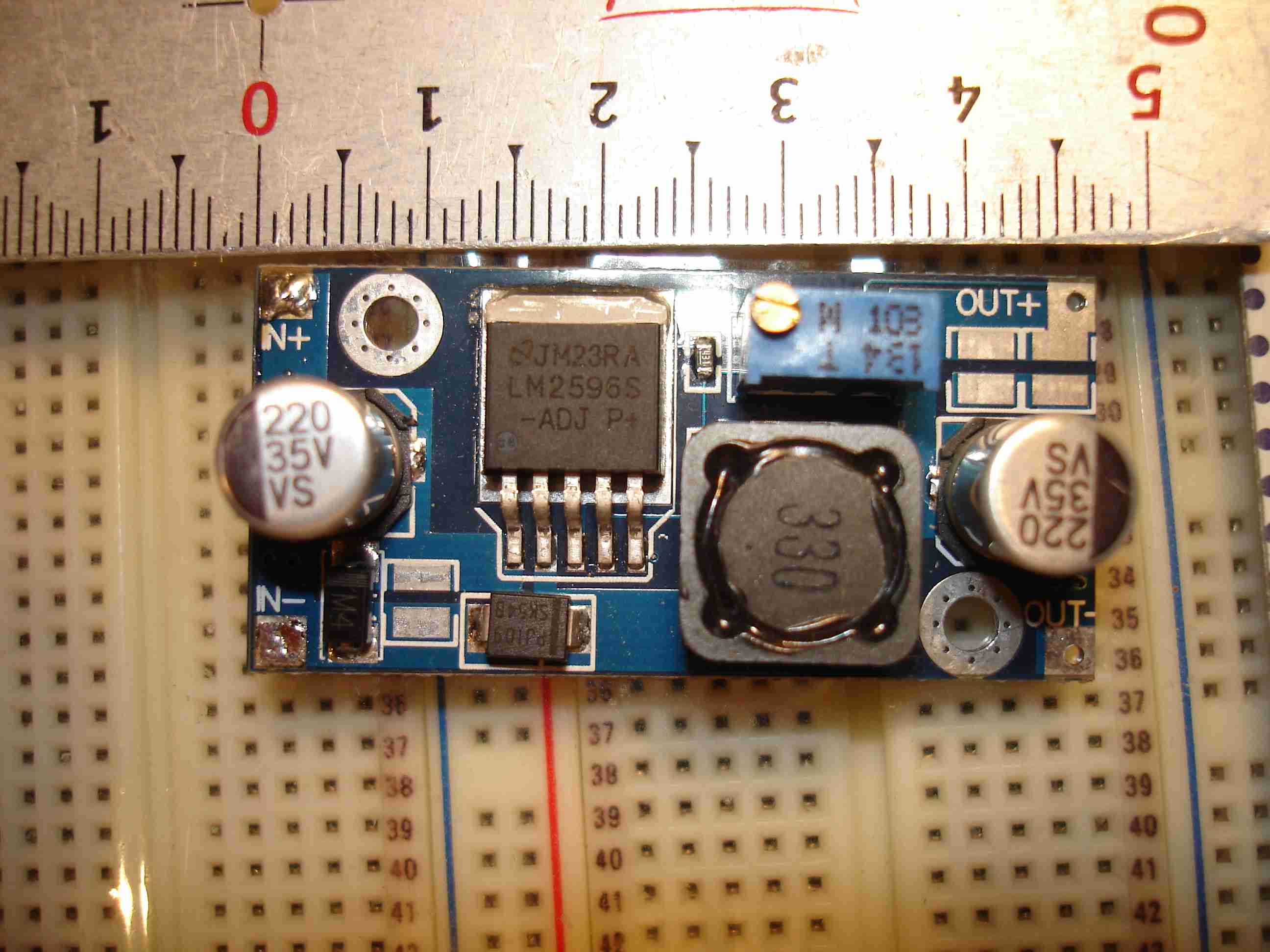 Comme le sous-titre de la photo l'indique, c'est une minuscule (4,7 X 2,5 cm) alimentation à découpage basse tension qui peut délivrer un courant de 2 A (3 A avec un radiateur) et comporte une tension de sortie ajustable entre 1 et 30V pour une tension d'entrée de 35v maximum.