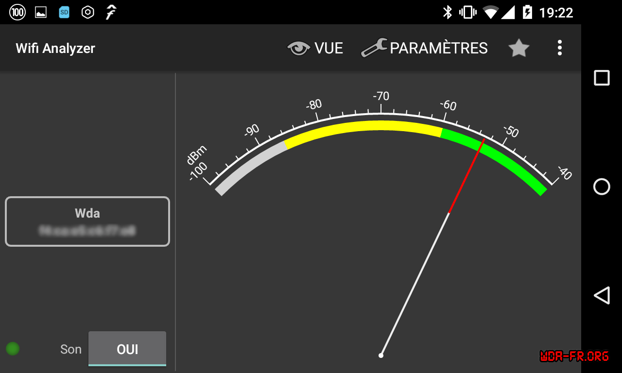 - Modulomètre (ou Signal-mètre) sur le canal du SSID WiFi de la WDA via Wifi Analyzer.