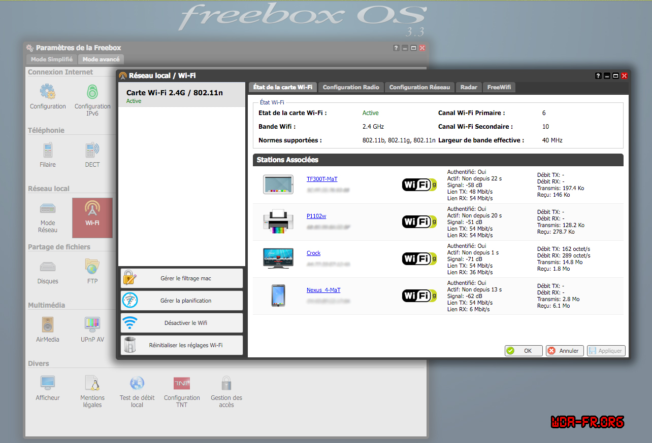 - Réglages WiFi de la Freebox v6 ("Revolution") via le tableau de bord interne de la Freebox v6 ("Revolution").