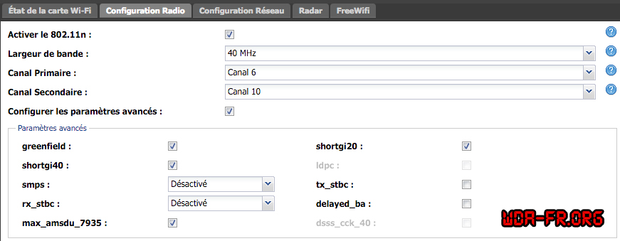 - greenfield : Cette option, si elle est activée, permet aux équipements compatibles 802.11n de communiquer entre eux plus rapidement si aucun autre composant WiFi antérieur (802.11a, 802.11b ou 802.11g) n’est présent dans leur champ d’action.