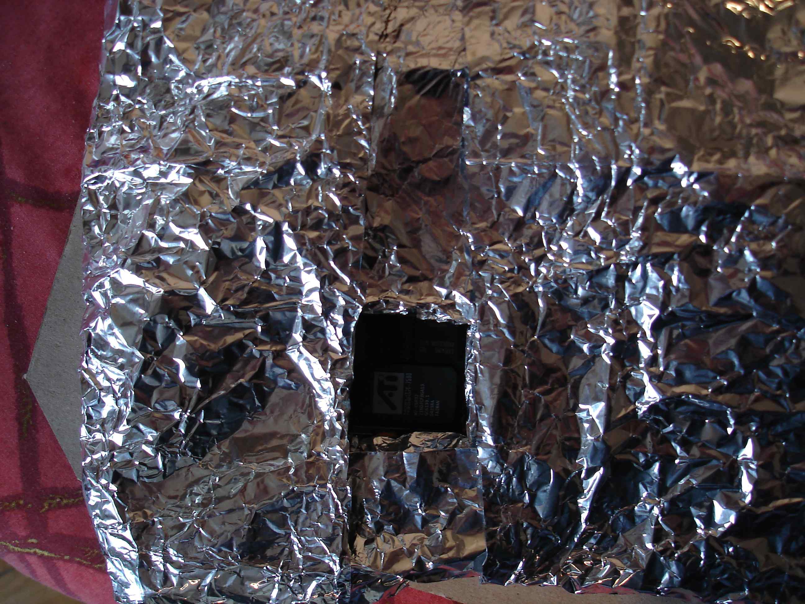 Après une bonne demi heure de repos, la carte a retrouvé une température normale, je la déshabille de son sandwich d'alu, ah...déjà c'est bon signe rien n'a brulé sur la carte et les connecteurs en plastique ainsi que le support du processeur sont intacts.