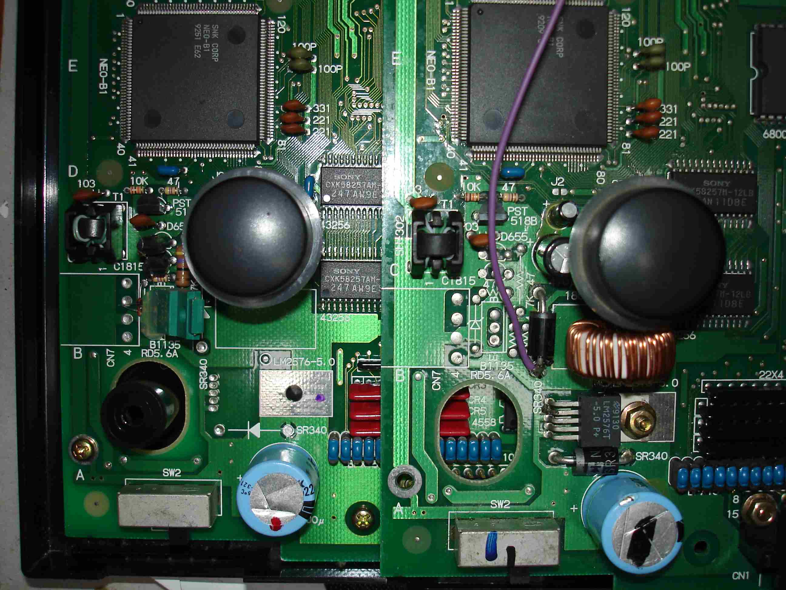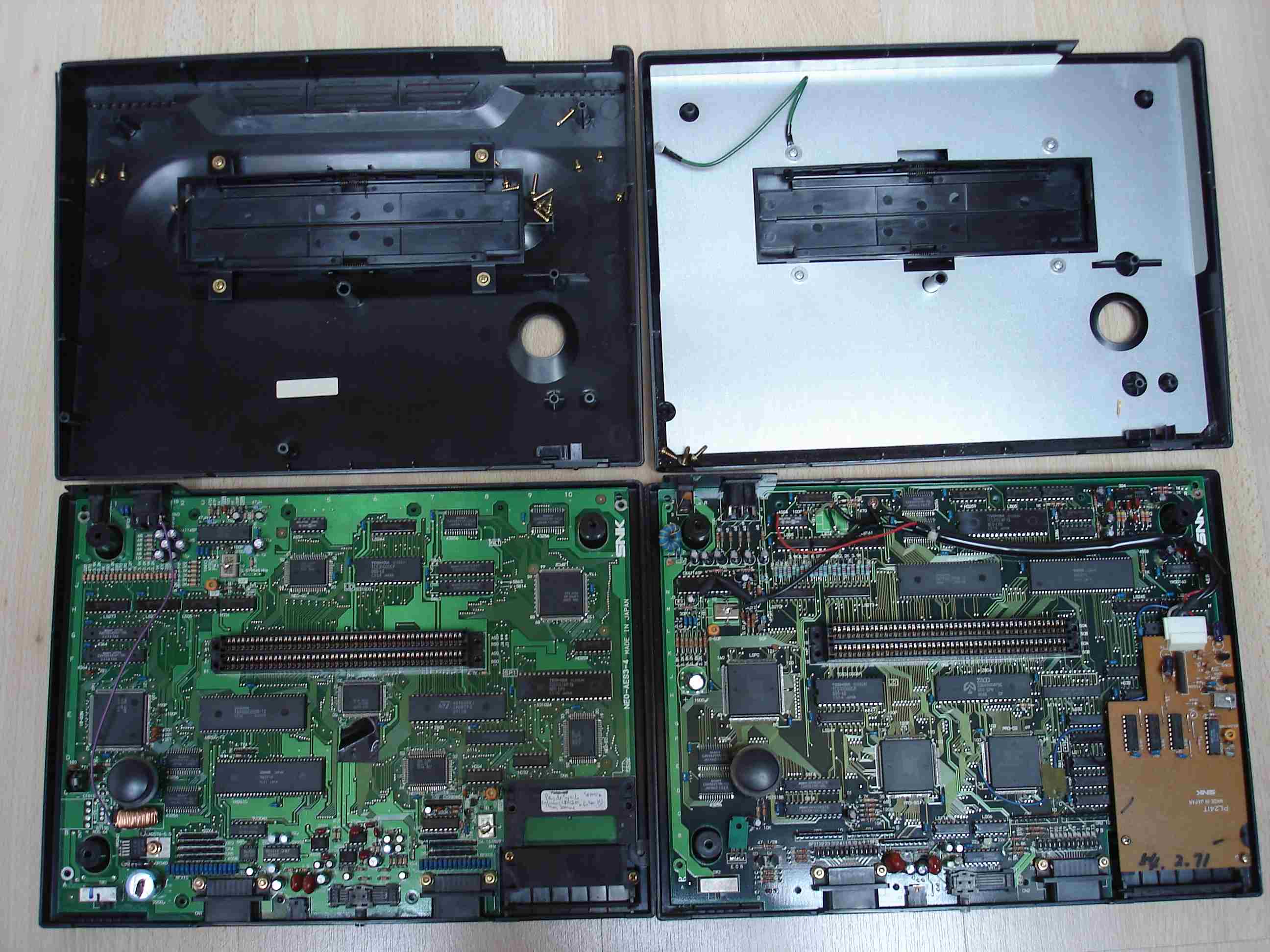 A gauche une Néo-géo "normale", à droite un modèle qui semble faire partie des premières séries construites car le circuit le plus récent est daté de janvier 91 et il y a la présence d'un blindage sur le capot supérieur et bien sûr le circuit imprimé rajouté sur la droite.