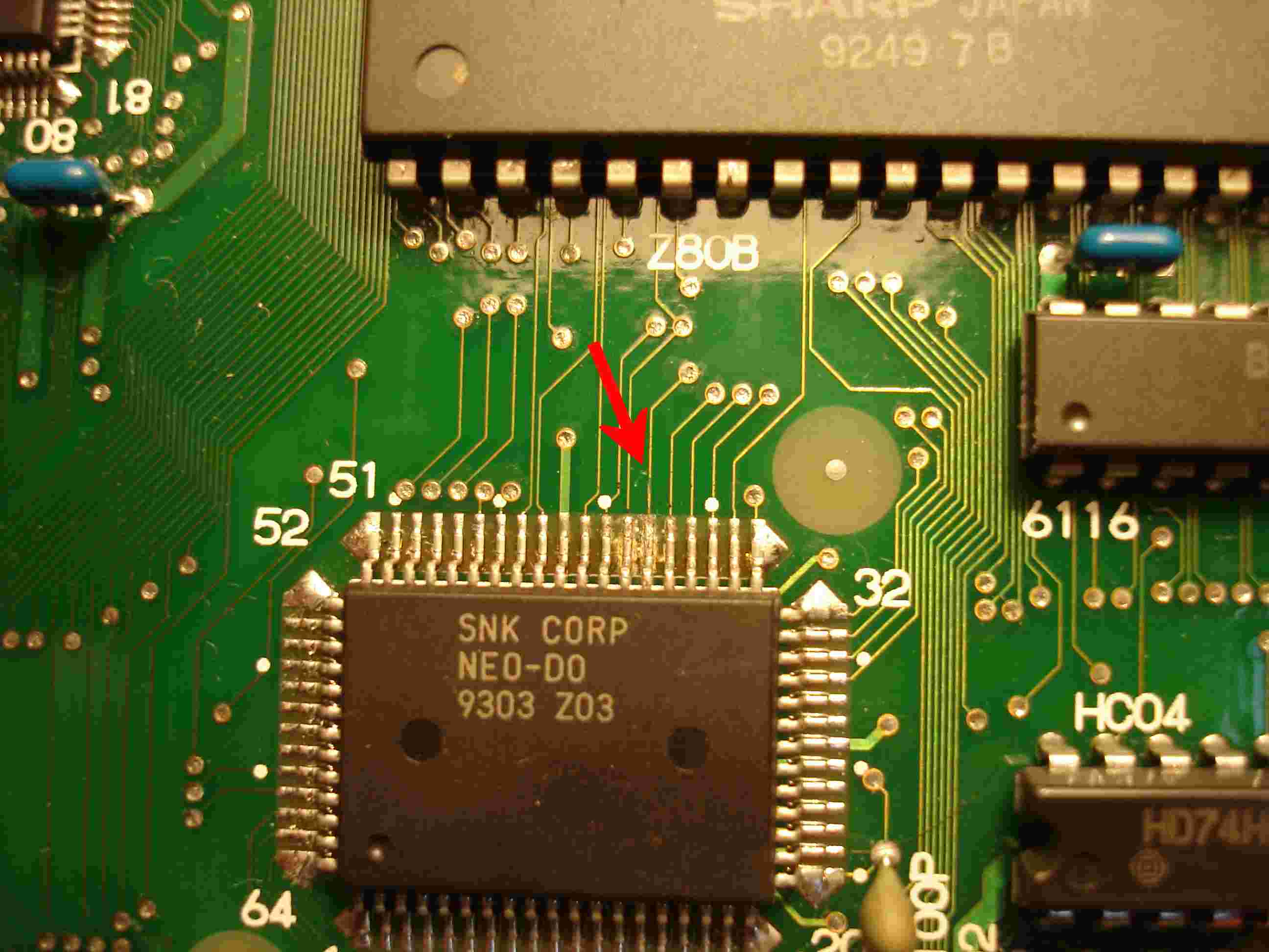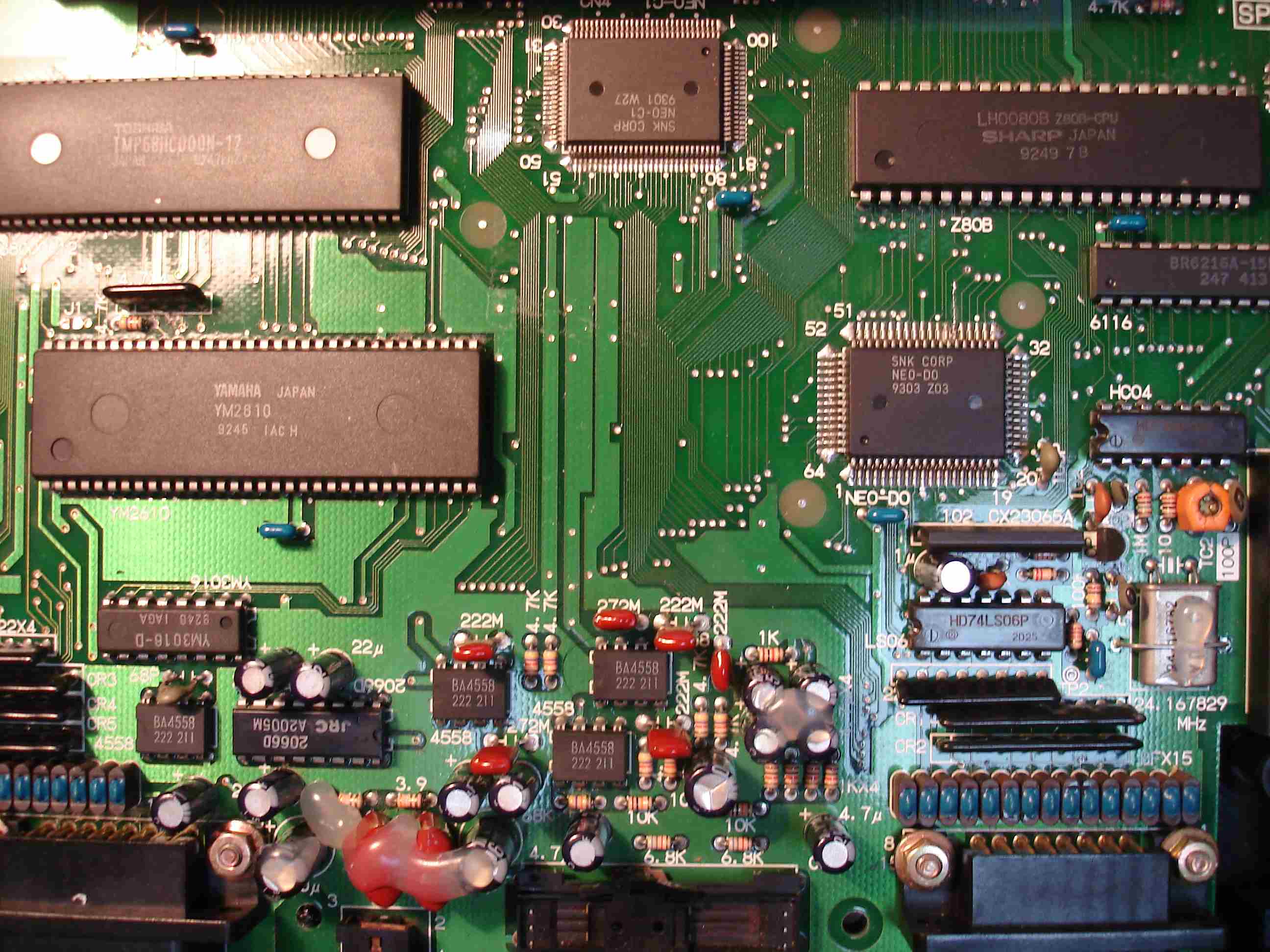 J'attaque la 4eme qui marche nickel mais n'a pas de son, les amplis et mélangeurs sont OK, je remonte petit à petit pour me rendre compte que la sortie série de l'YM2610 vers le DAC (YM3016) ne fonctionne pas, en remontant encore je m'aperçois que les lignes de sélection, d'écriture et de lecture de l'YM sont à 1 en clair l'YM n'est pas sélectionné. en cherchant où vont les lignes de sélection (merci la fonction beep du multimètre !) j'arrive sur un circuit spécifique NEO-DO et là c'est la cata car si le circuit est HS il n'y a rien plus rien à faire à part jouer sans le son.