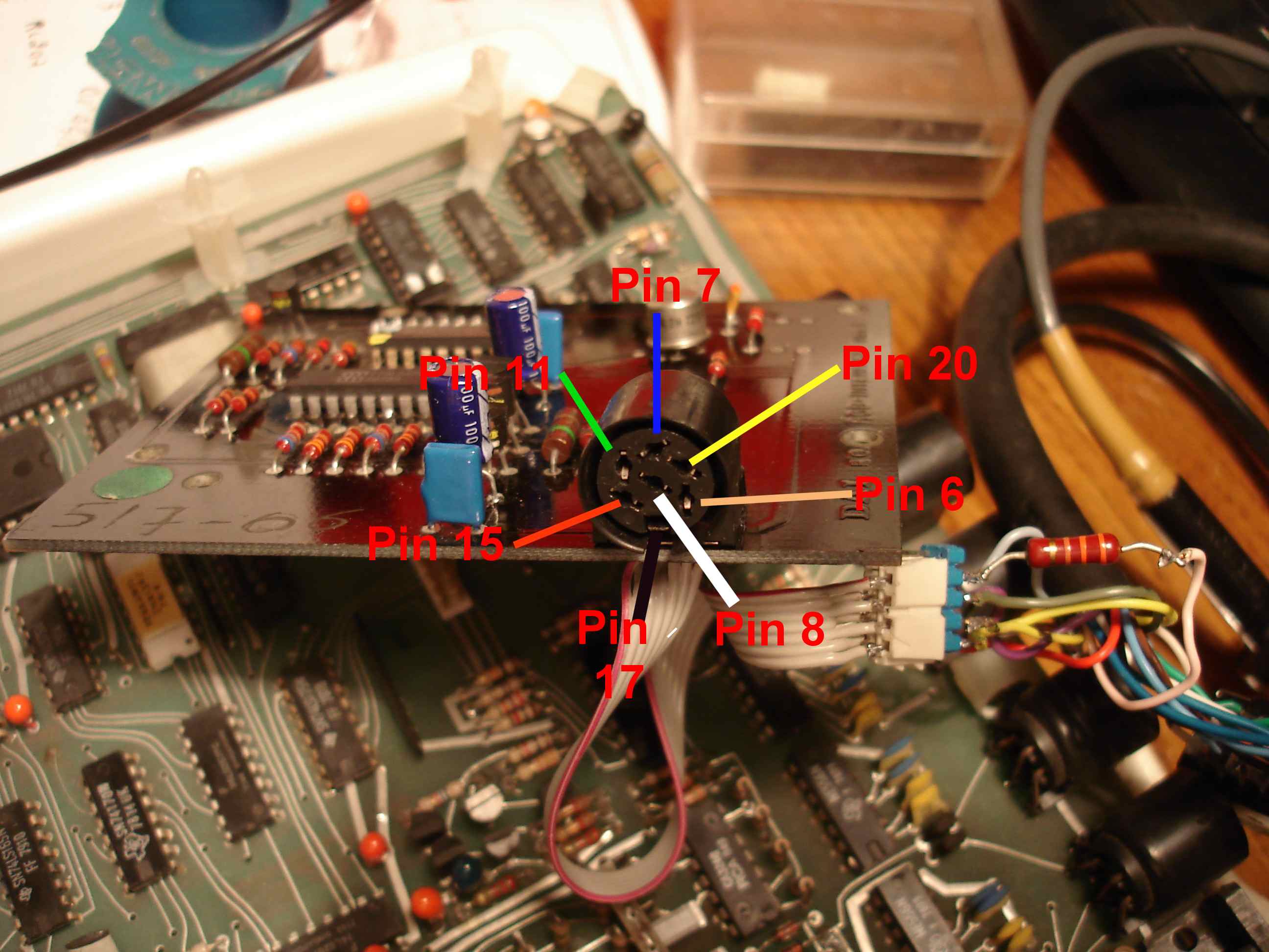 Ci-dessous le câblage de la prise DIN, sur la partie droite, on voit le connecteur et la résistance de 220 Ohm.