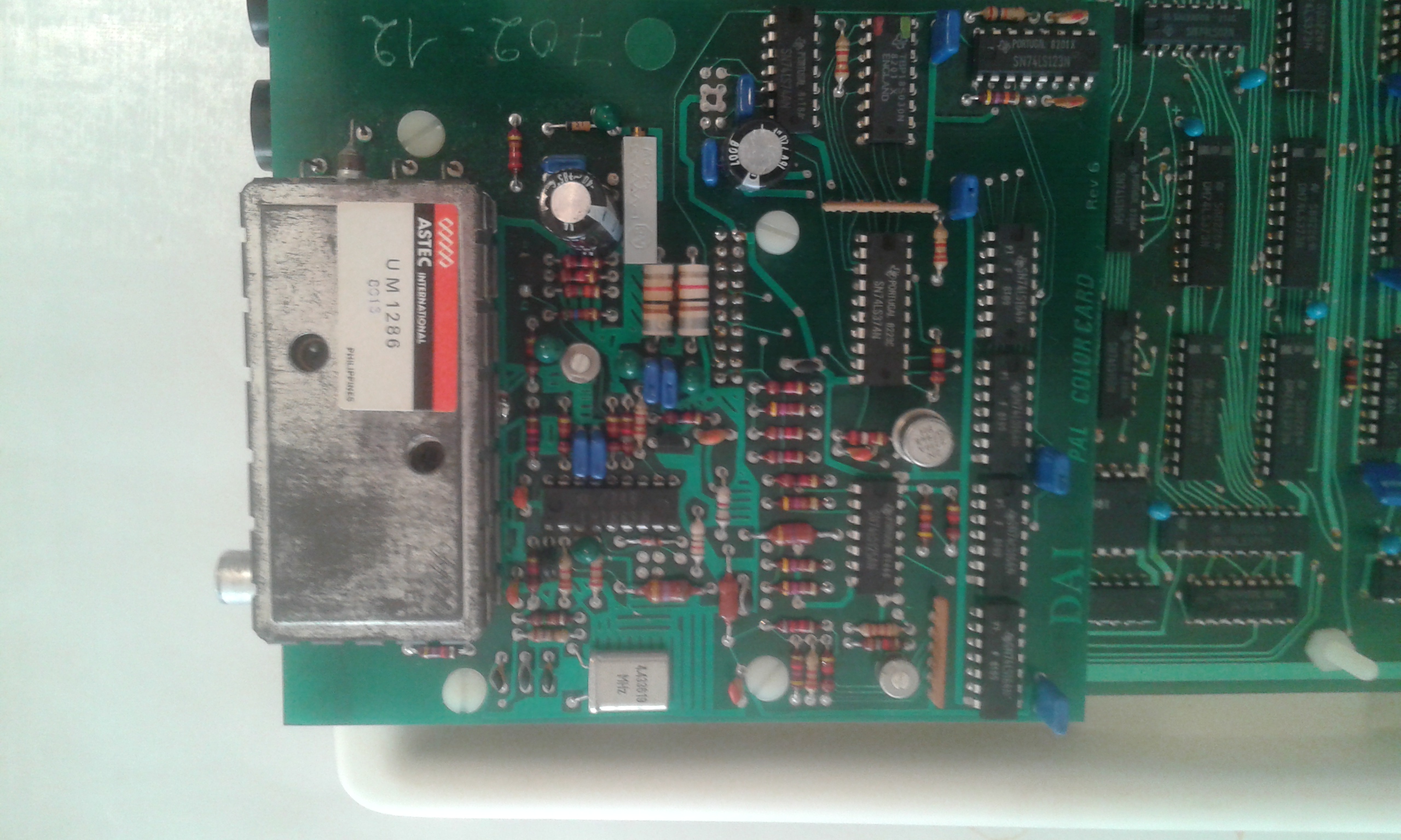 Pour ce qui est de la carte vidéo, c'est une PAL COLORCARD rev 6. Dans le DAI que j'avais acheté en 1980, la carte vidéo avait deux sorties: VHF et RGB. Celle-ci n'a que la VHF canal 04. Le modulateur est un ASTEC UM1286.