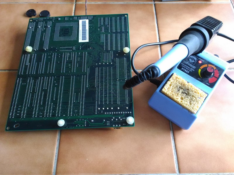 Au passage, l'arrière de la carte mère (et le fer à souder qui préchauffe...).