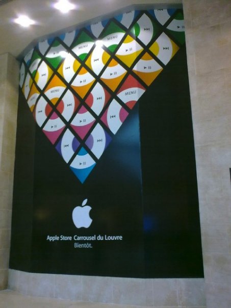 L'info a circulé de façon accélérée, l'emplacement est connu depuis des mois : Sous la pyramide inversée, au Carrousel du Louvre. Depuis une semaine, la communication de la firme à la pomme croquée s'accentue. Les couloirs du métro du Louvre se sont habillés pour la circonstance. Une date tombe : Inauguration du temple le samedi 7 Novembre 2009, à 10 Hrs. J'ai créé pour l'occasion un événement Facebook. N'hésitez pas.
