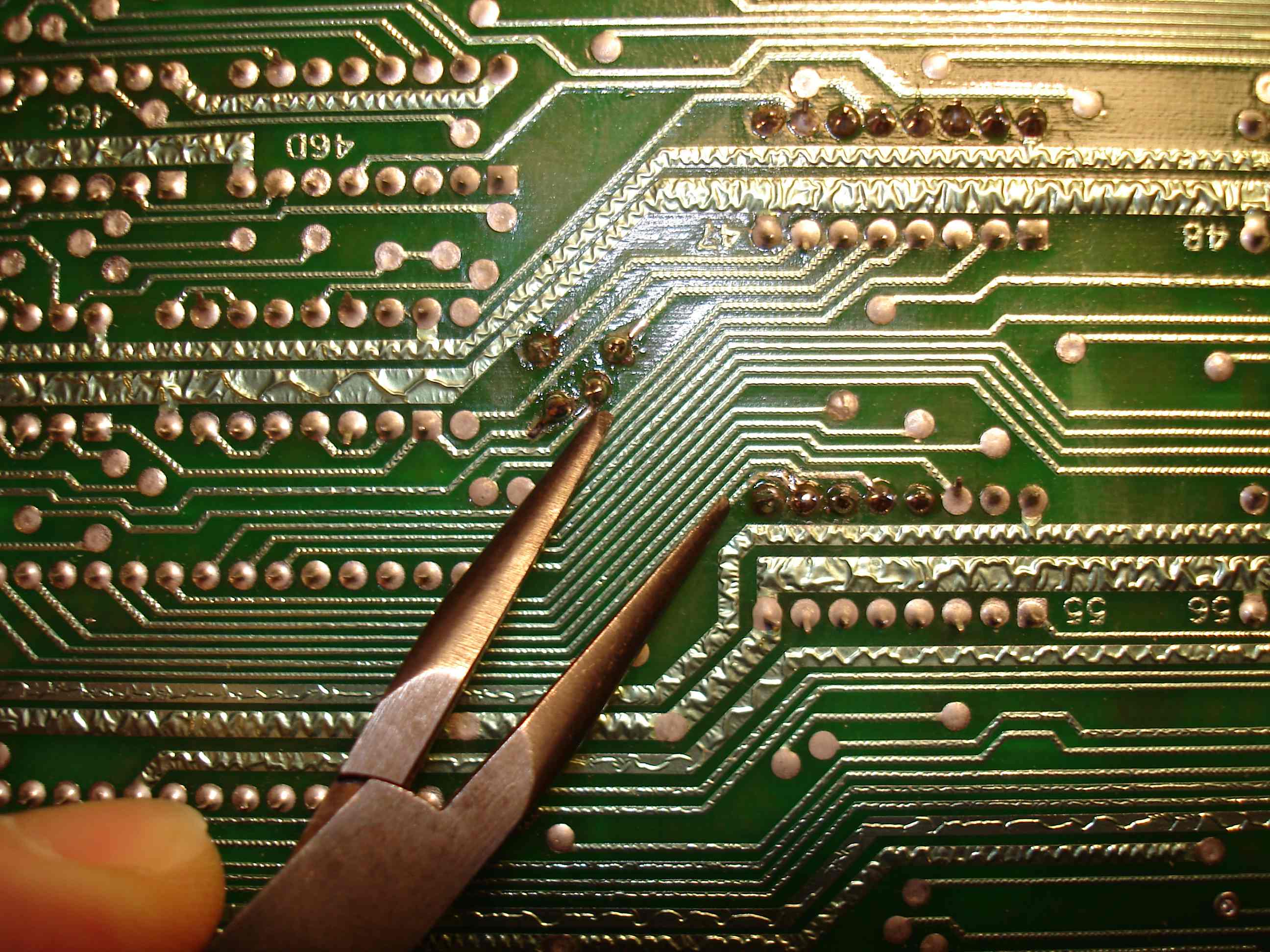 J'ai dû encore gratter pour que la soudure prenne et le résultat n'est pas terrible mais au moins il y a continuité, j'ai utilisé des queues de résistance pour refaire les continuités sur les soudures en haut à gauche.