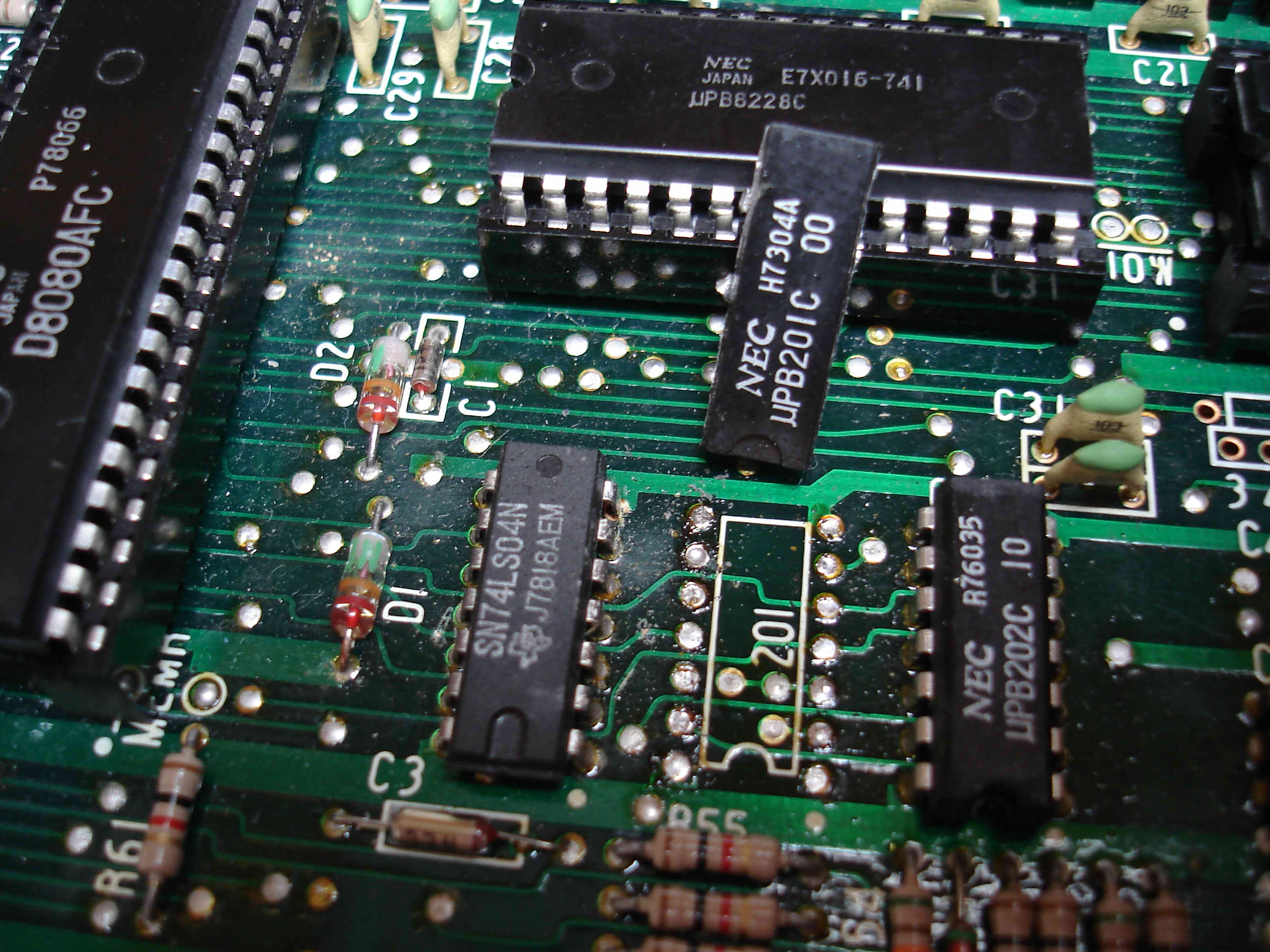 Finalement j'ai effectué les tests avec le seul 8080 OK sur les deux et j'ai trouvé le petit circuit maudit qui mettait la grouille, il s'agit d'un µPB201C de NEC plus connu sous le nom 7400, c'est un quadruple NAND.
