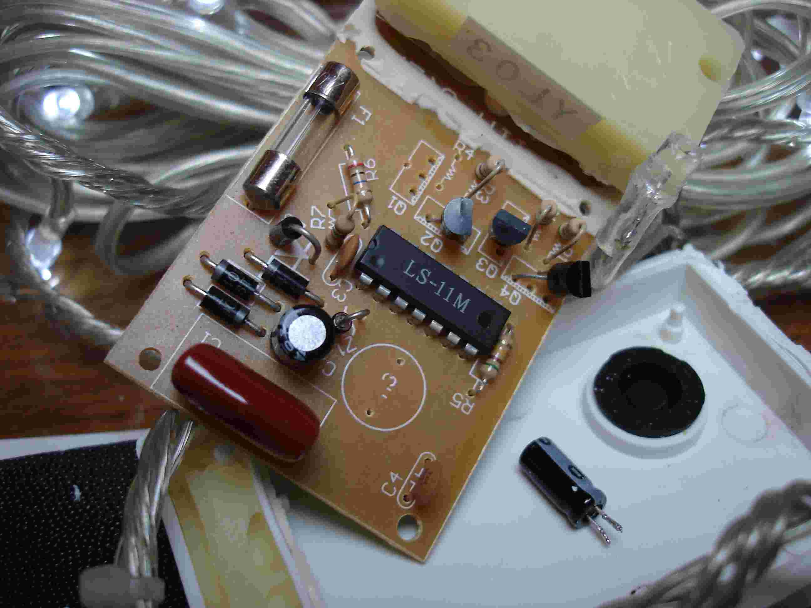 Ce matin j'ai trouvé une guirlande lumineuse dans la rue, bien sûr elle était en panne. Après ouverture, pas grand chose dans la boite, un micro-contrôleur, 3 FET, un pont de diode, et 2 ou 3 bricoles dont une zener de 5,6V qui m'indique sous quelle tension le circuit intégré doit être alimenté, un coup de voltmêtre, 0,5 v pas bon ::( , changement du condensateur de filtrage et hop, roule... :mrgreen: .