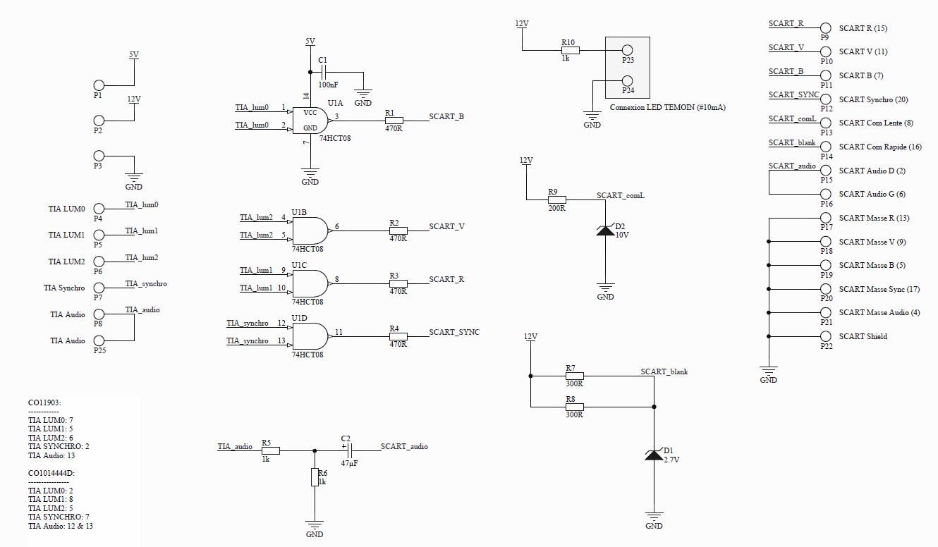 - la TV ne commute pas sur la chaine AV --> vérifiez la tension > 9V en P13. Si OK, ça vient forcément du branchement