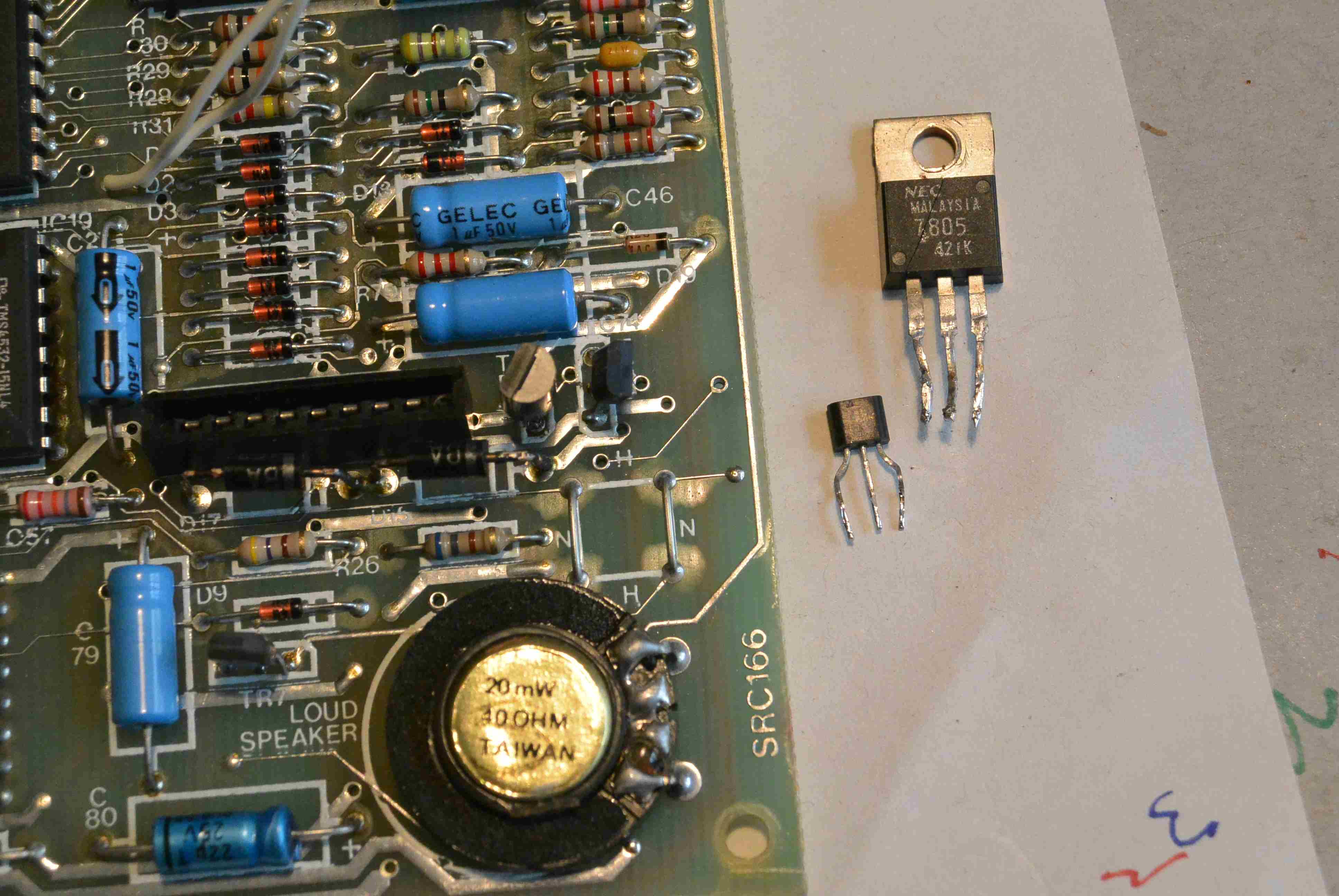 Comme d'habitude, avant de brancher, un bon examen visuel de la carte mère ne fait pas de mal. Au bout de quelques secondes, une belle fêlure est repérée sur le régulateur 5V de type 7805 en haut à droite.