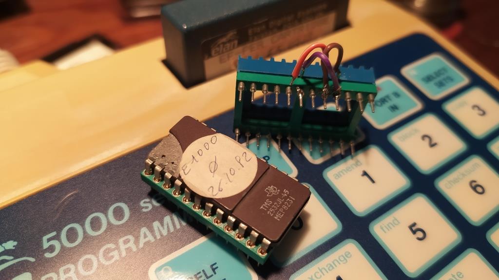 Sur la photo on voit que l'Eprom 0 a pris cher, céramique cassée, pattes tordues mais finalement elle fonctionne bien, ouf ! . J'ai dû la mettre sur un support intermédiaire car les pattes n'auraient pas supporté un enfichage et désenfichage. Sur l'adaptateur, le strap vers le CS est déconnecté, c'est normal, c'était juste pour un petit test.