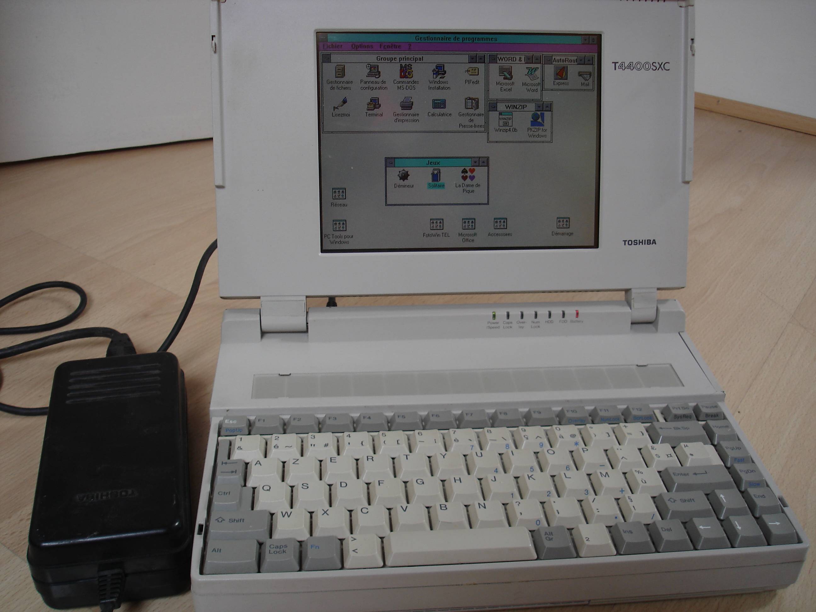 Toshiba 4400SXC, 4 Mo de Ram 486sx25 remplacé par un 486 DX2-50, disque de 120 Mo et un bel écran en matrice active.