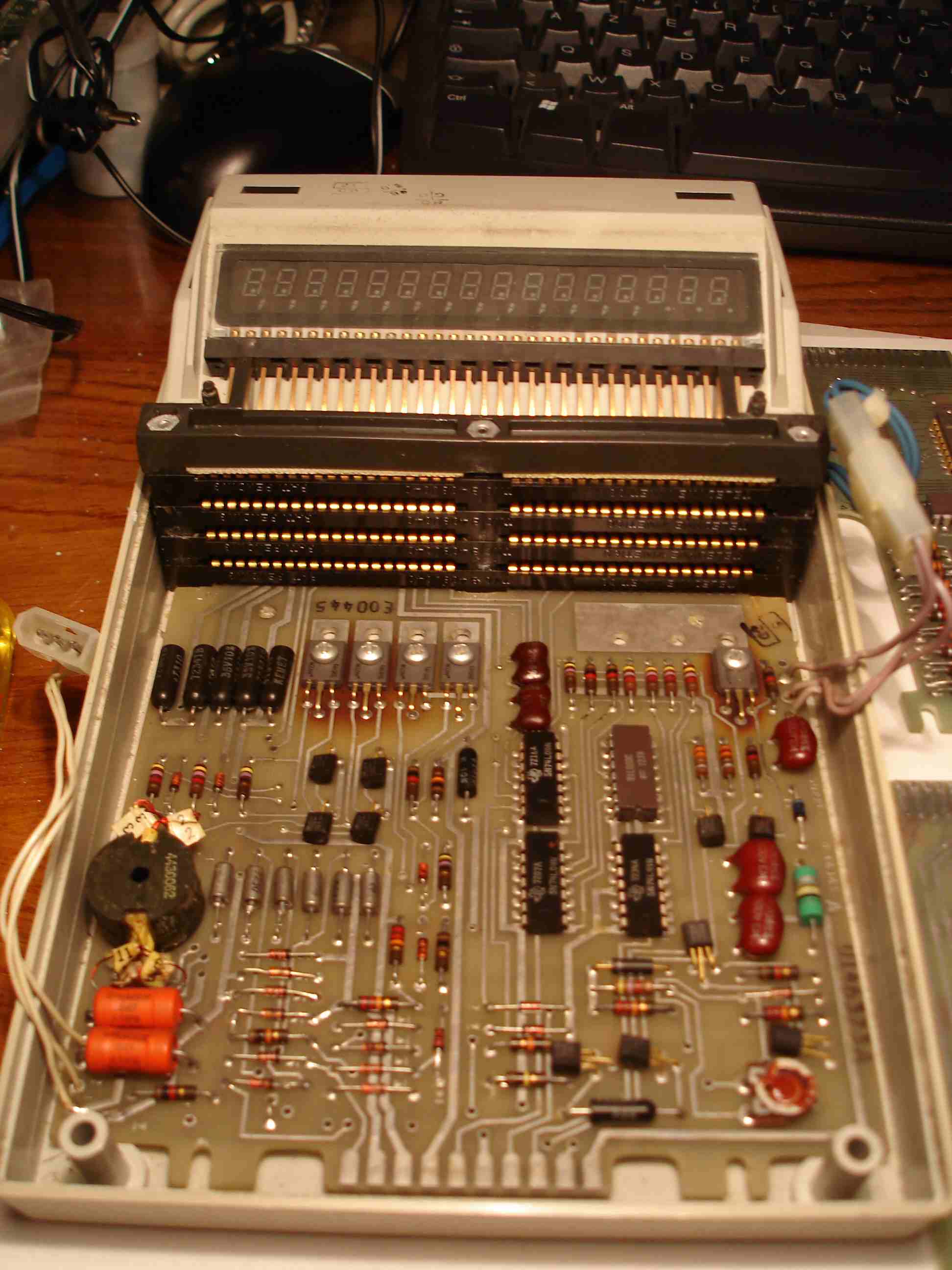 Eh oui... l'informatique en ce temps là coutait la peau des fesses. Un Powermac 7100/66, un Mac II Ci transformé en Quadra 650, un Quadra 800 (merci à Mr PRUVOST pour ce don généreux !), un disque D2 (design Starck ), un magnéto-optique 650 et sa cartouche. Ma dernière acquisition tout droit sortie d'une poubelle, une magnifique calculatrice programmable de 1973 Compucorp 322G. Le seul souci est qu'elle ne fonctionne pas d'où un démontage en règle, on peut admirer au passage la fabrication identique à celle d'un ordinateur - des cartes connectées entre elles par l'intermédiaire d'un fond de panier ! Après remontage, le problème est identique, la calculatrice affiche toujours la même chose, bon tant pis... mais c'est quand même un bel objet !