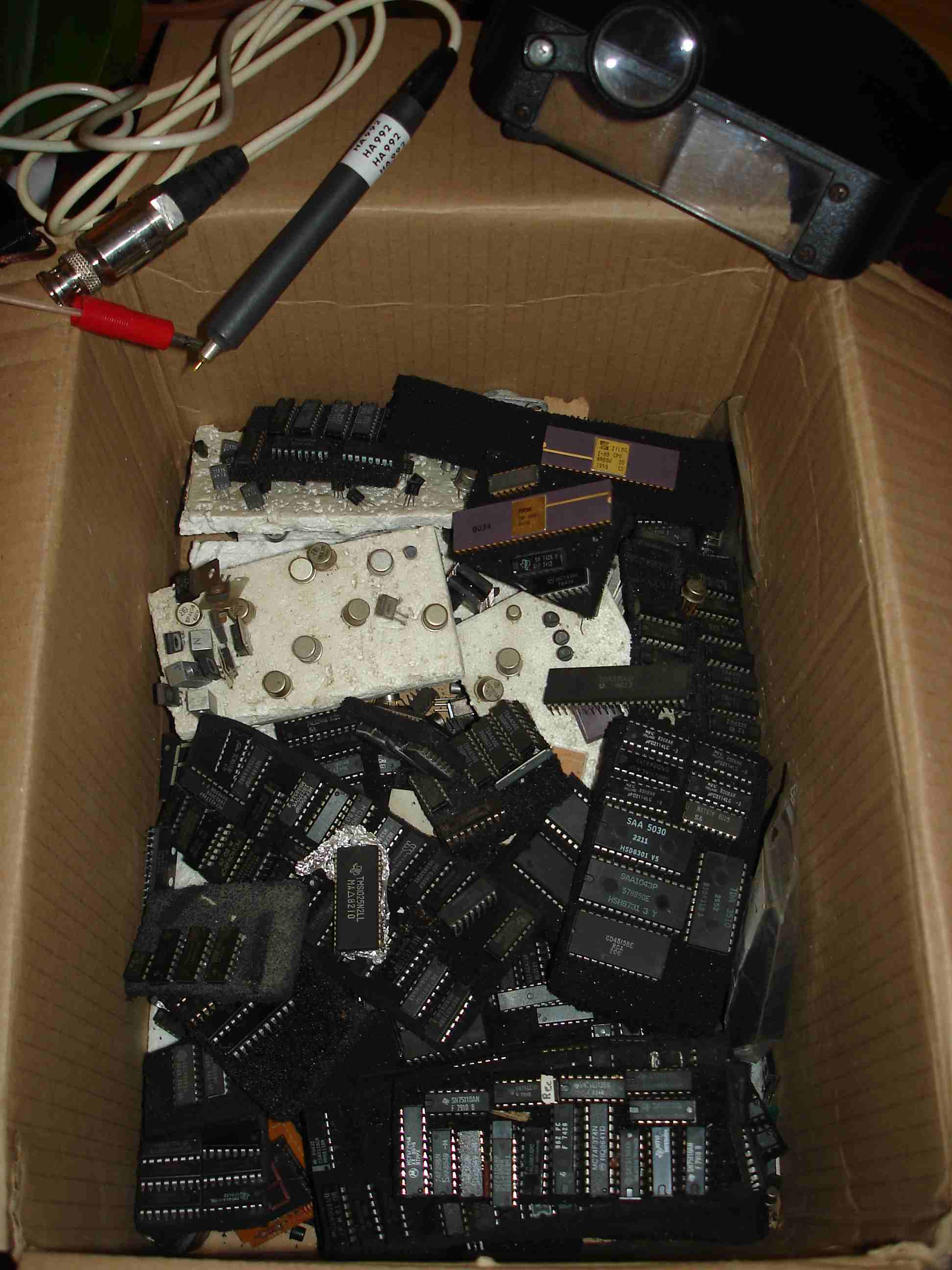 Plein de circuits TTL et CMOS comportant des dates codes de 72 aux années 80, des mémoires, des processeurs, des afficheurs, une belle série de circuits vidéo TCA et TDA, des transistors germaniums, des transistors de puissance, des transistors HF, des FET des unijonctions, des triacs, des thyristors, une sonde active HF pour oscilloscope et des supers lunettes pour bricoler des machins minuscules.