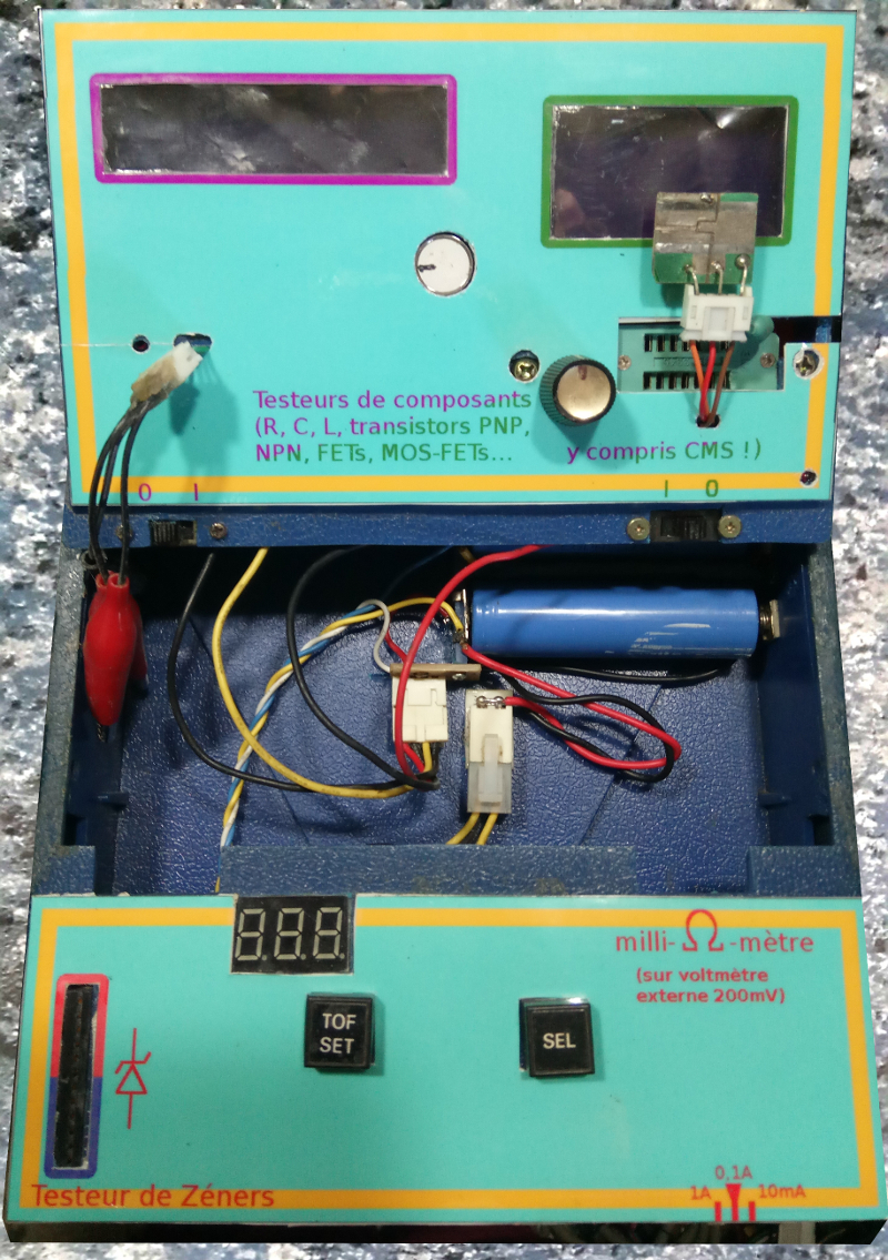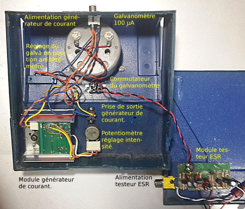 — Une fois ceci fait, je perçai la partie bleue d'un très gros trou pour y monter un galvanomètre 100µA récupéré “on ne sait où”, tout ça pour y inclure le générateur de courant constant réglable et le testeur ESR :
