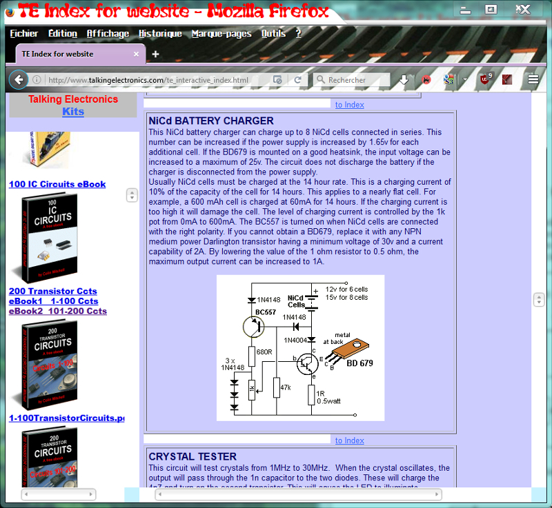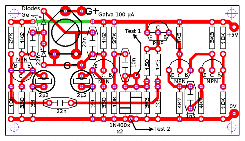 — Dans le même module, après avoir inclus le générateur de courant constant réglable, j'ai voulu utiliser le galvanomètre 100µA pour autre chose : un testeur d'ESR (Equivalent Resistance Serie) pour tester des condensateurs électrochimiques. Après quelques recherches, je suis tombé sur ce forum anglophone :