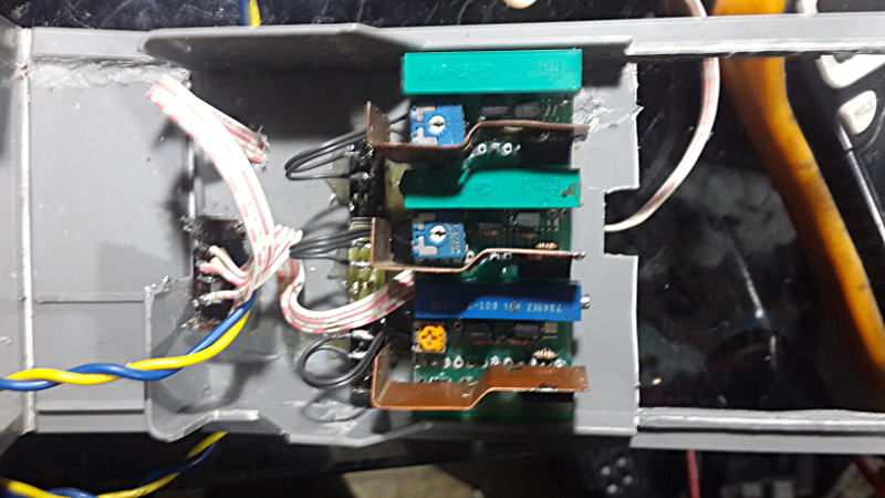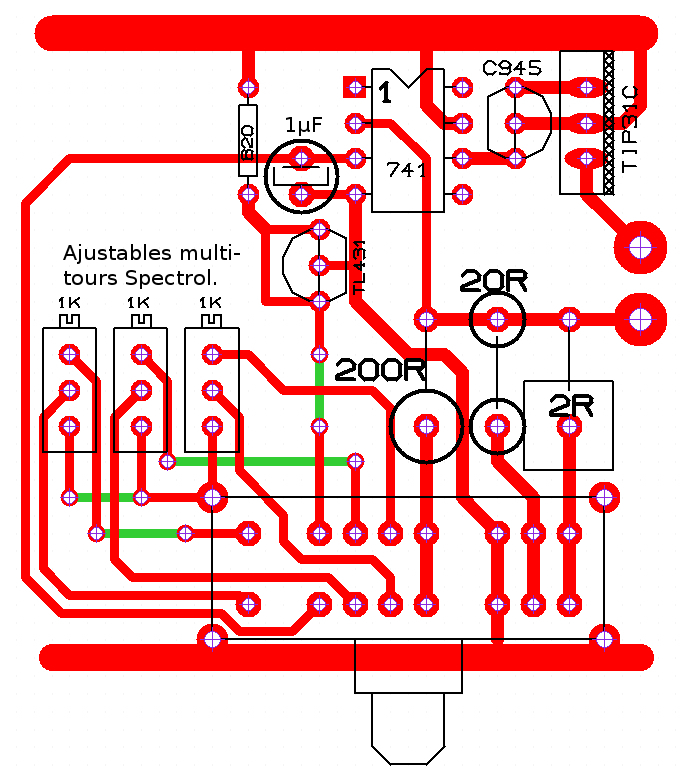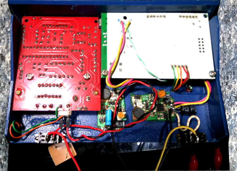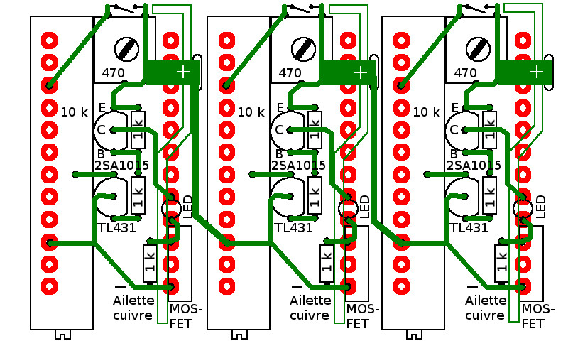 — “Fouinant” sur le Net, je tombai sur ce petit schéma : , puis sur celui-là : — Et ensuite, sur celui-là : — Exactement ce qu'il me fallait ! Mais, ayant entretemps récupéré des transistors MOS-FETs sur d'anciennes cartes-mères d'ordinateurs en panne, je l'ai modifié ainsi : — Et, comme à mon habitude, dessin d'un PCB (avec T.C.I) et câblage sur un bout de platine imprimée avec du fil de cuivre autosoudable, en ayant enlevé toutes les pistes et ne gardé que les trous métallisés : — Prochaine étape : le bac à batteries.