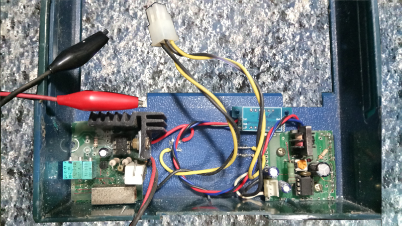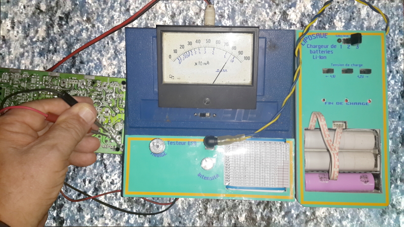 — qui, aussitôt “dégaîné” mon traducteur, s'est révélé une vraie mine d'or : — Sitôt dit, sitôt relevé le schéma, j'avisai une petite platine ayant support un microprosseur d'imprimante et le montai dessus : — Après essais, sur l'allimentation 5V low-drop, il fonctionne “nickel” ! Bien sûr, j'avais monté un inverseur pour le galvanomètre afin de pouvoir le commuter entre la charge batteries et les tests ESR !
