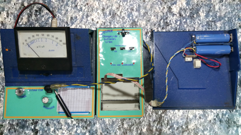 — J'avais aussi récupéré des bouchons de baies 5,25" de faces avant de PCs et je suis tombé sur ce qu'il me fallait : — Montage dans un boîtier de cassettes “Betamax” que j'avais “rétréci” pour autre chose et qui s'est révélé exactement ce qu'il me fallait : — Essais avec une ancienne version de mon générateur de courant réglable : — Voici le module chargeur de batteries/testeur ESR monté dans le boitier de “flexettes” et en pleine action : — Premier module terminé ! Et maintenant, le module “testeur en tous genres” !