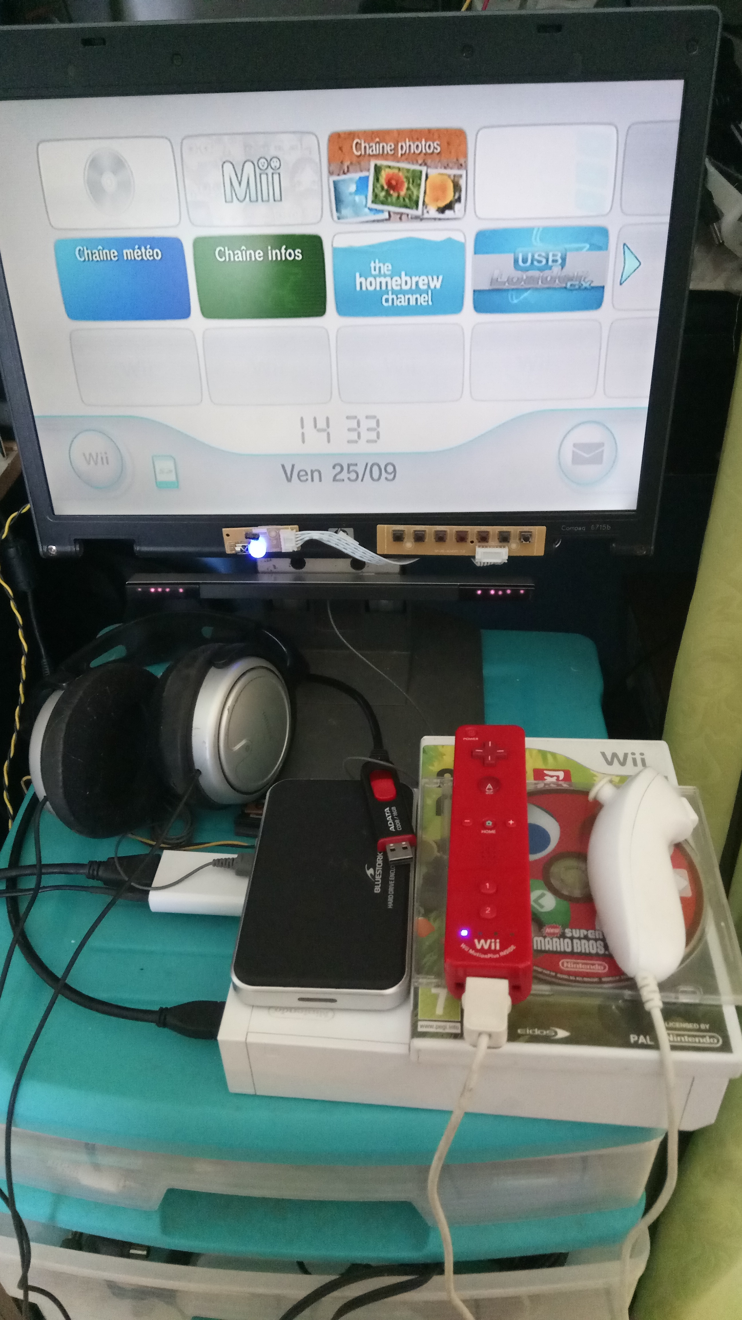 — Avec “Letter Bomb”, “Pimp my Wii” et quelques autres bricoles logicielles (firmware 4.3E). Je peux jouer des jeux enregistrés sur mon DD externe : il y a même un jeu où j'ai besoin de la Wiimote avec le motion+ et le nunchuk, la totale, quoi (la Wiimote rouge qui est sur la console – cette wiimote fonctionne aussi sur PC avec un adaptateur Bluetooth, sur Dolphin-Wiimotion+ !) ! Pour le son, je branche un casque 32 ohms sur la sortie son du module Wii/HDMI.