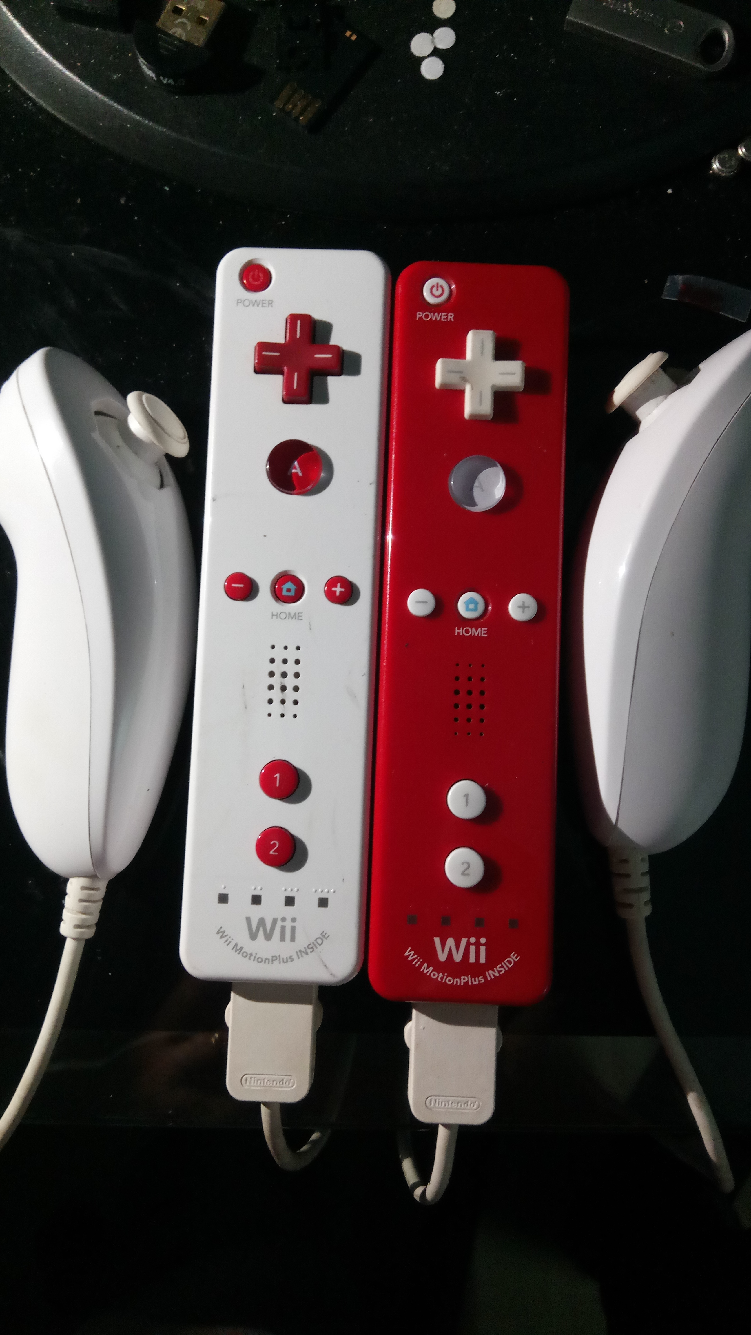 — Je rentre chez moi, teste la Wiimote motion+ et la sensor-bar : tout fonctionne “nickel” ! En plus, ce sont des blanches alors que j'avais commandé sur Internet une Wiimote rouge ! Du coup, j'en ai une pour la console et une pour mon PC, vu que j'ai retrouvé un nunchuk fonctionnel ! Il y a de fortes chances que j'inverse les boutons : les rouges sur la blanche et les blancs sur la rouge ! Ah ! Voilà qui est fait :