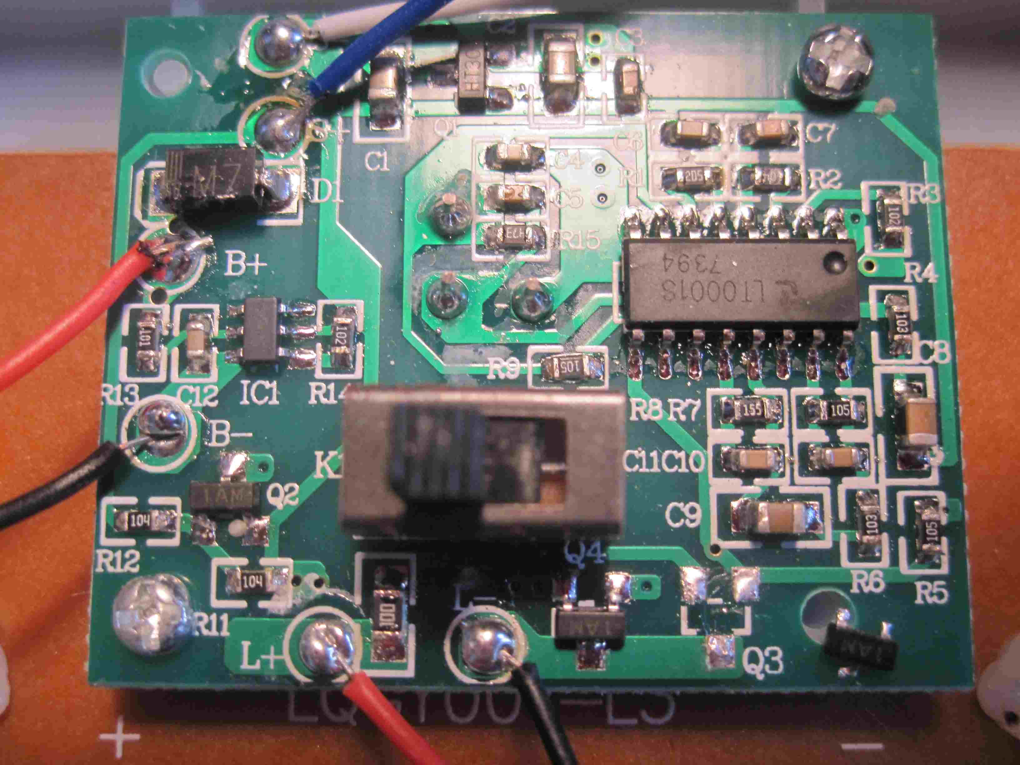 — Je me tourne alors vers une “vieille connaissance” : le circuit intégré 34063, qui est capable de beaucoup de choses, notamment de piloter une série de LEDs sur une tension aussi basse que 3,7V, soit une batterie 18650 de récup' de batteries d'ordinateurs portables ! Mais d'abord une simu sur l'excellent logiciel “LTSpice” : , puis, avisant une platine de chargeur de téléphone portable pour automobile (avec prise allume-cigares) qui “arborait” ce genre de circuit intégré, je la modifiai pour répondre à ce cahier des charges, à partir de ce schéma : — Voici donc la “lampette” en fonctionnement : — Depuis, comme je me lève la nuit au moins une fois pour mes “petits besoins”, je n'allume pas la lumière et ne dérange pas ma femme !