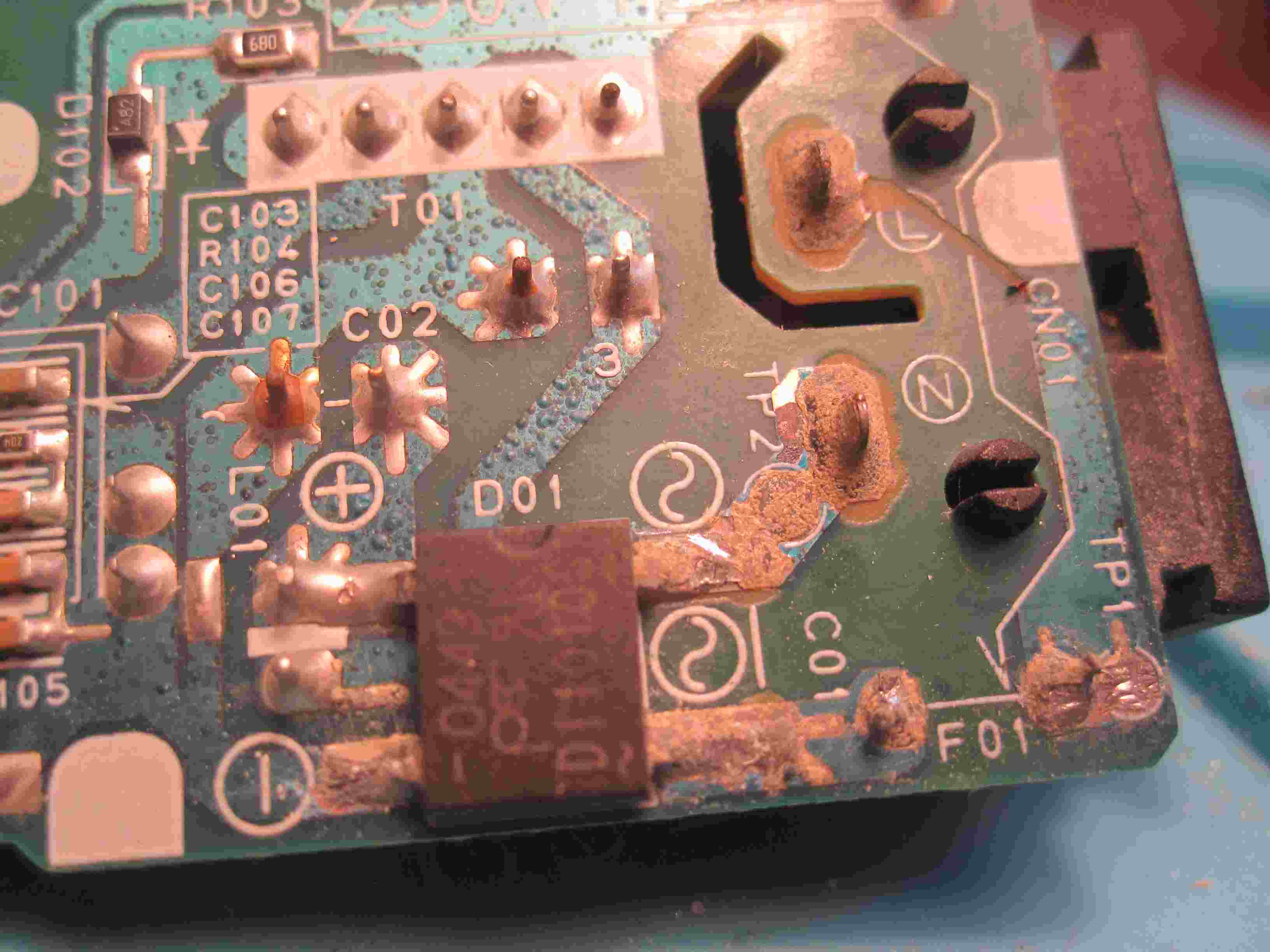 et ces petits fourbes ont entrainé dans leur chute, le pont de diode, une piste du circuit imprimé qui est partie en fumée (à coté de la lettre L) ainsi qu'un fusible