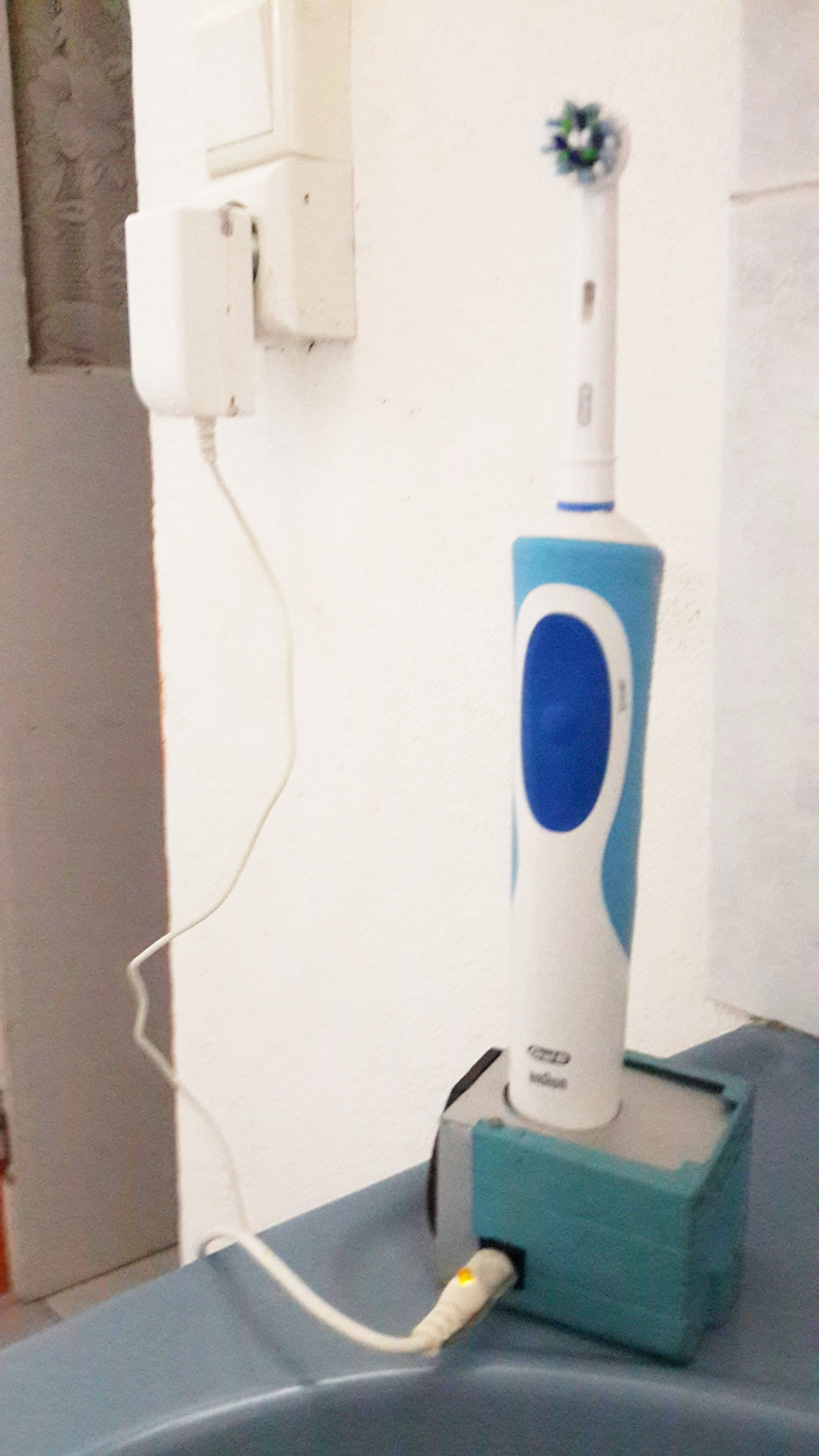 — Dans les bacs de recyclage, je trouve parfois des brosses à dents électriques “Oral B” qui, parfois, fonctionnent encore ! En ayant récupéré une, je me mets en tête de réaliser un chargeur pour ladite brosse… Oh ! Pas le chargeur 230V d'origine, indémontable et souvent en panne, mais une “astuce” à partir d'une alimentation 12V de box Internet, par exemple…