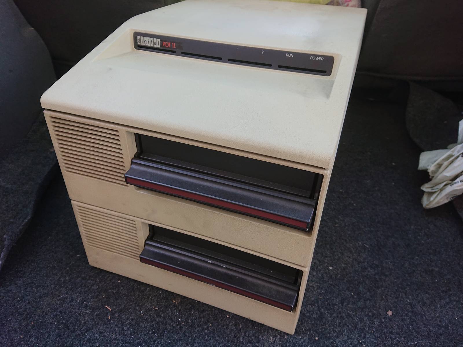 Un DEC Professional 380 (moyennement compatible PDP-11) et son double lecteur de disquette 5"1/4 bizarre