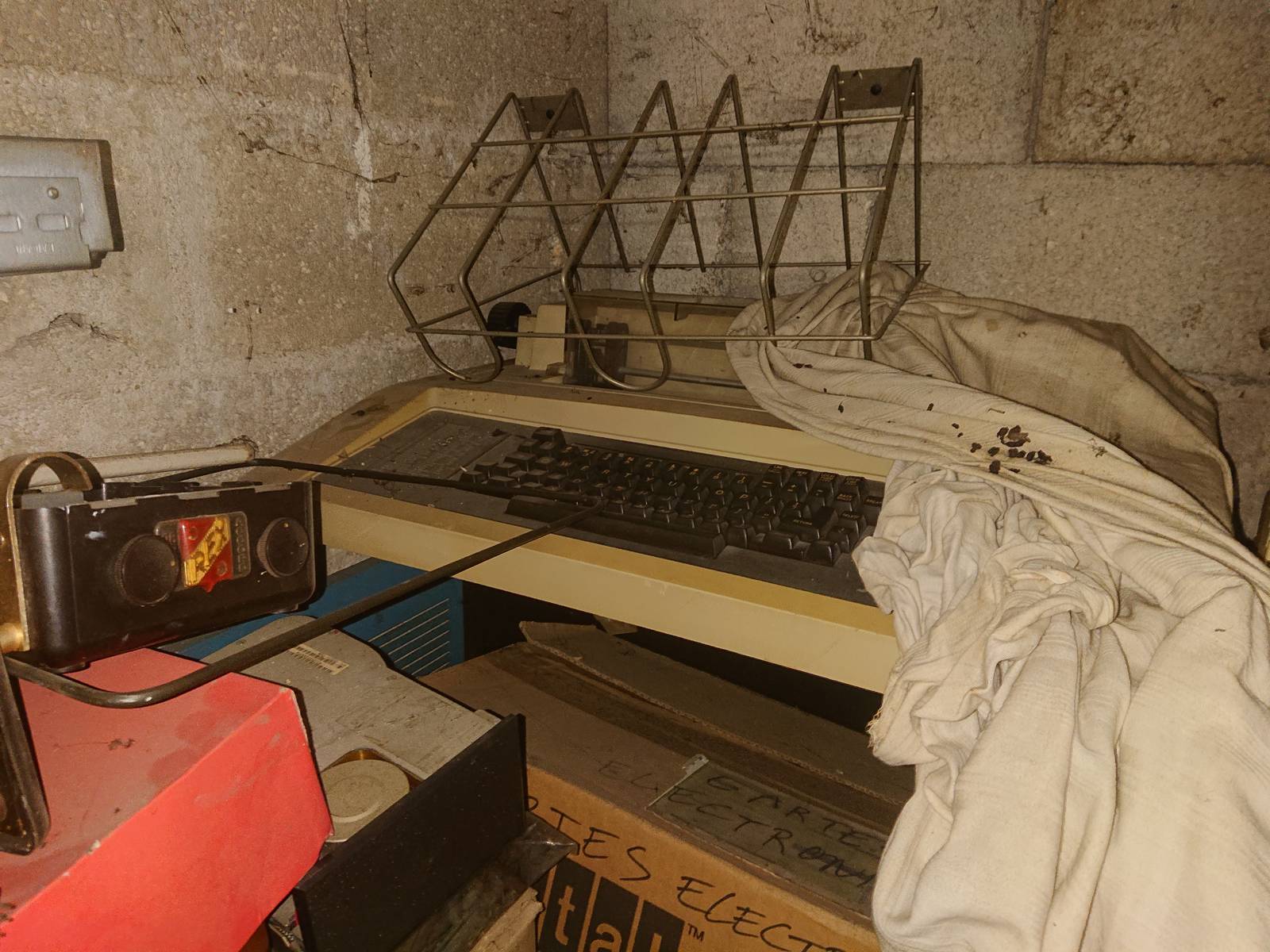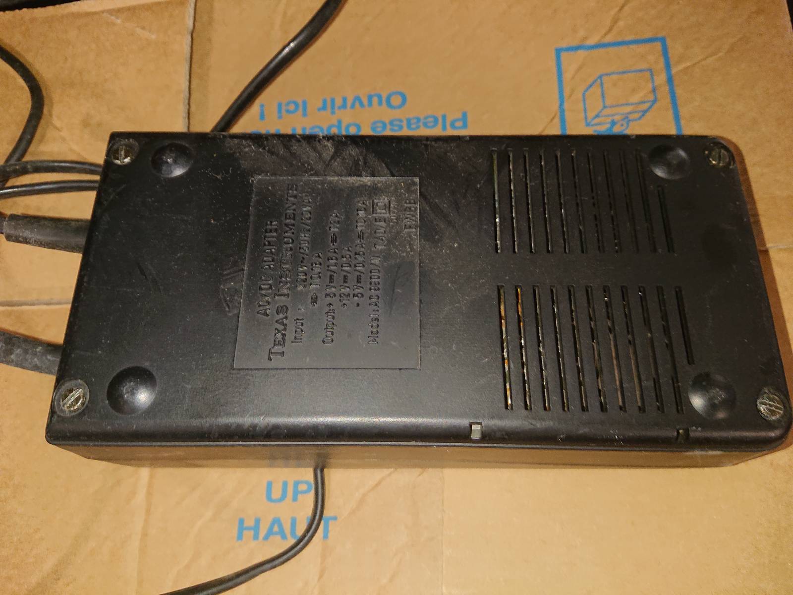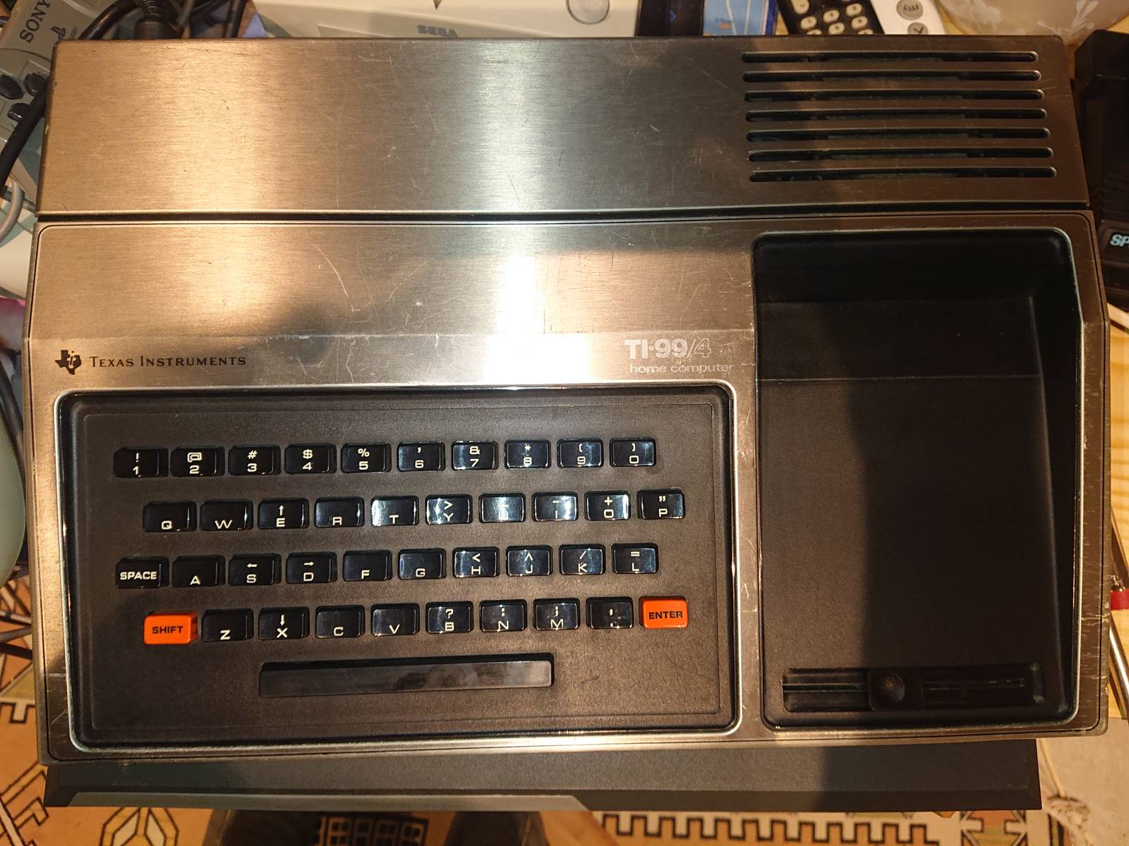 Au dessus du tas j'aperçois un TI 99/4A sans boite. J'en ai déja un, mais pour voir je demande le prix, et le mec ce met a "creusé" dessous dans le bazar accumulé et au bout d'une minute me sort une boite de TI 99/4A. Il l'ouvre et dedans un joli TI 99/4. Je n'en avait jamais vu en vrais.