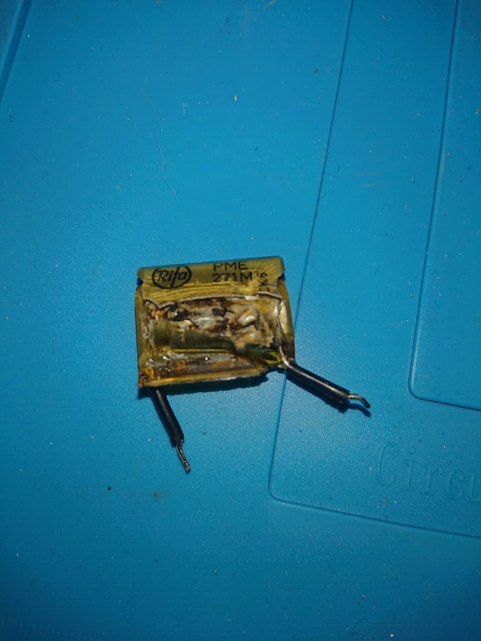 Test de l'alimentation. Un gros PET avec de la fumée et la bonne odeur de l'acide du condensateur.