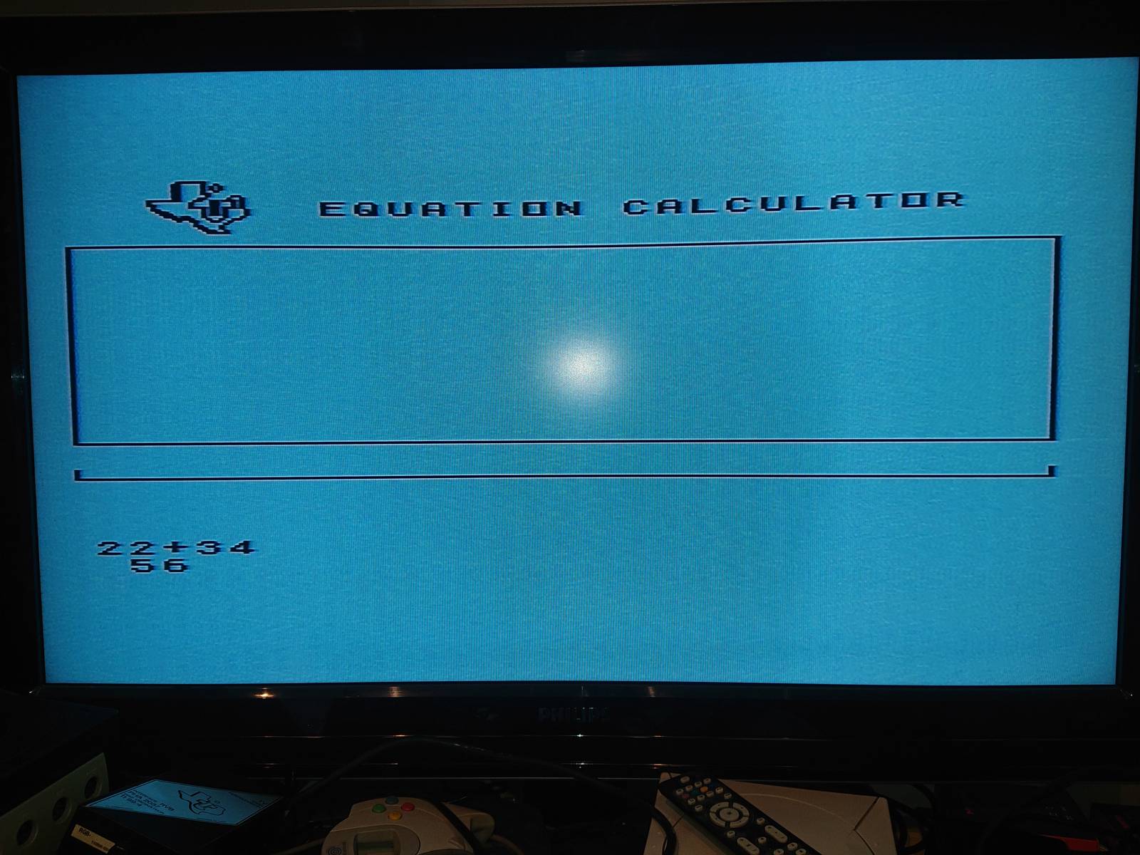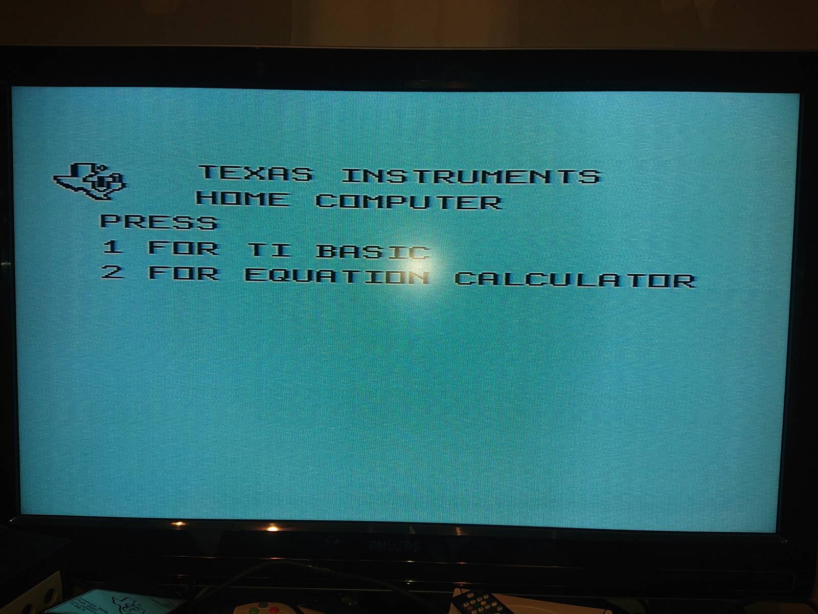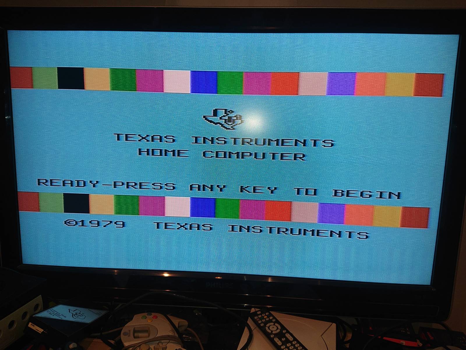 Premier test avec l'adaptateur péritel du TI 99/4A que j'avais déjà (j'ai pas testé les 2 adaptateurs antenne PAL fourni avec)