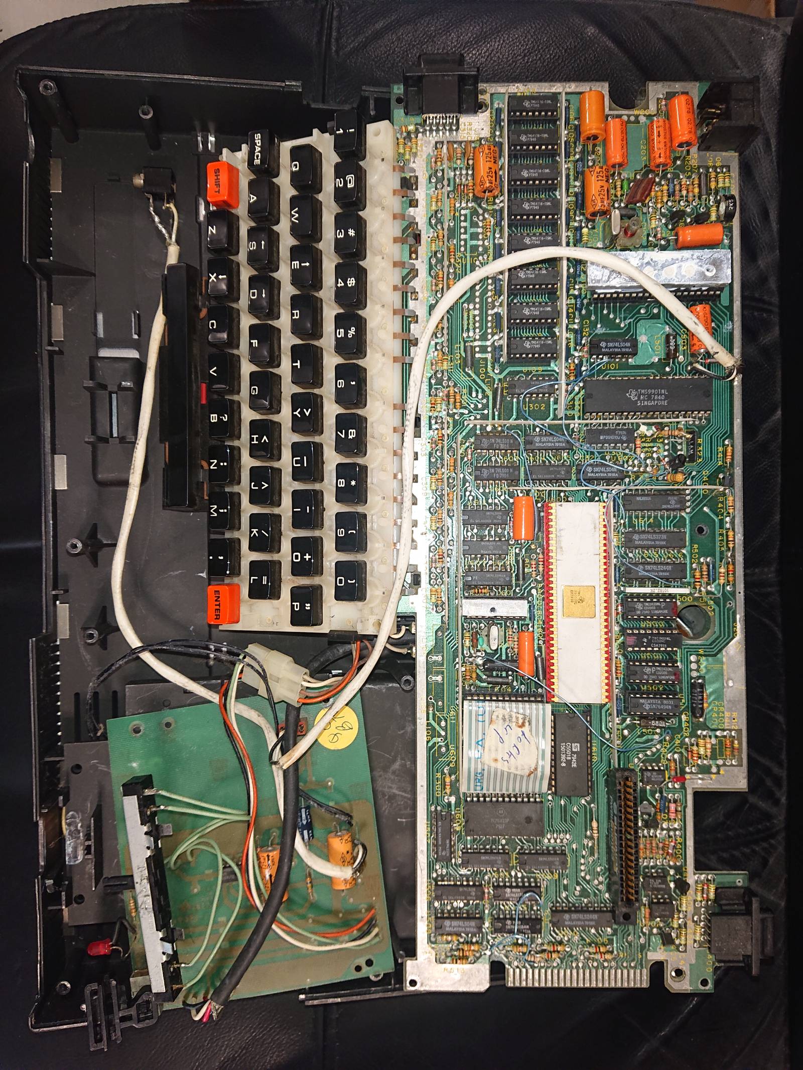 Enlèvement, après dessoudage du fautif. Le coup classique du condensateur antiparasite je connaissais l'histoire sur les TO9 et les flippers mais ignorait sa présence dans l'alim du TI 99/4 qui est différente et incompatible avec celle du 4A.