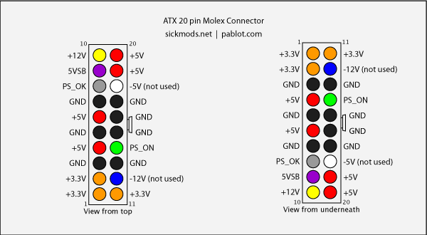 Pour faire démarrer une alimentation ATX il suffit de connecter un bout de fil entre les broches 14 et 15 du connecteur à 20 broches, normalement le 14 c'est un fil vert qui est juste à coté de 3 fil noir (0V).