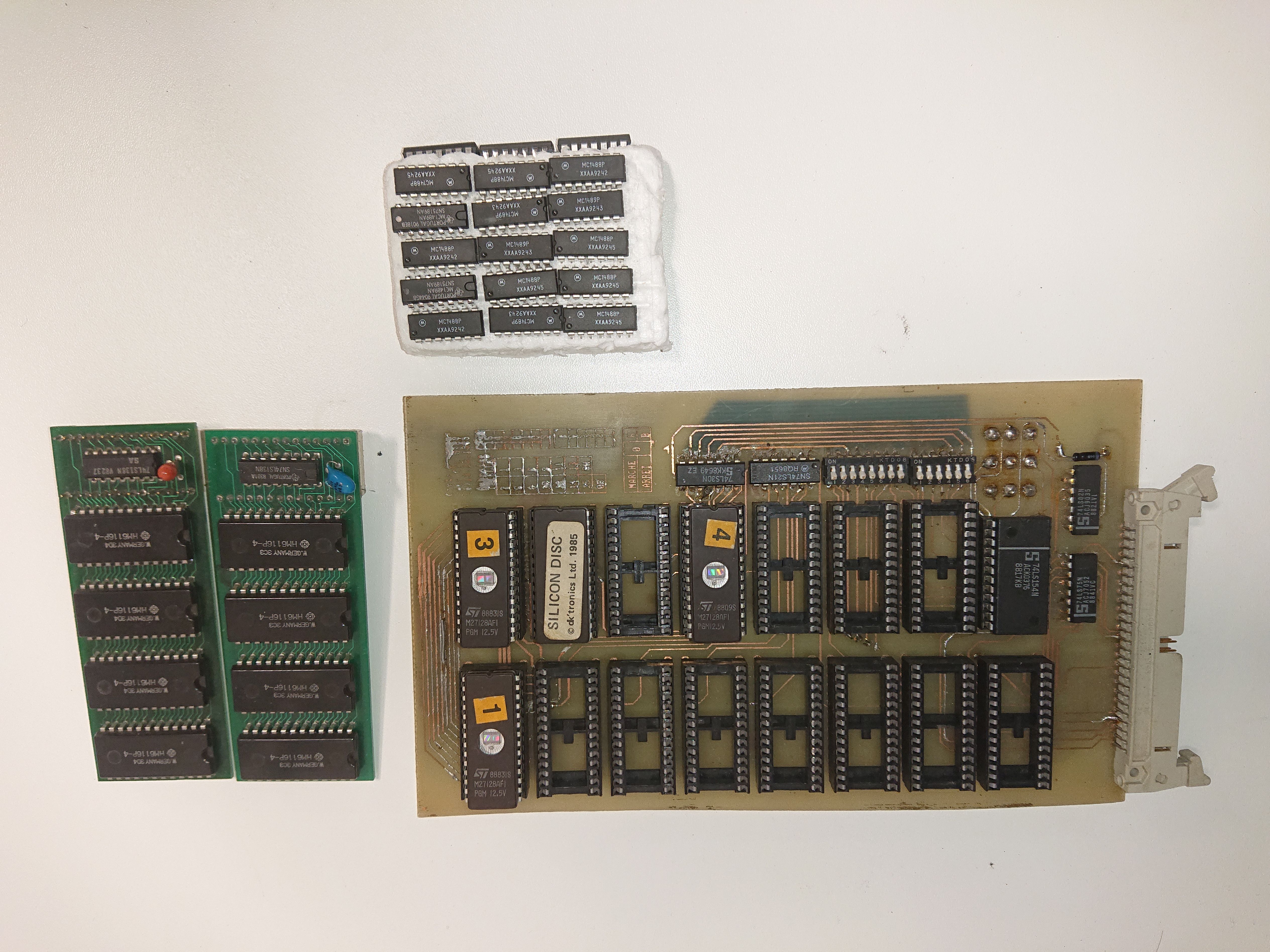 • De la ram static, un lot de drivers rs232 et une carte d'eproms pour Amstrad que j'avais conçu et fabriqué quand j'était lycéen (elle ne fonctionnait pas très bien).