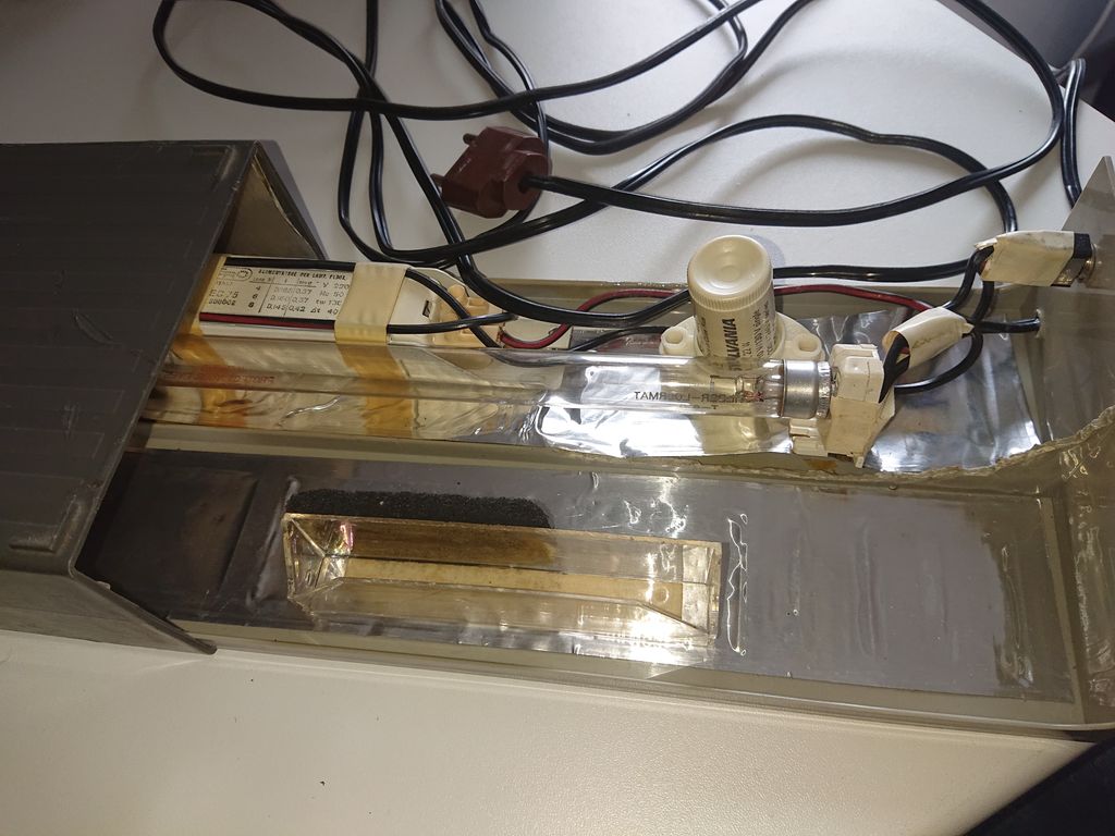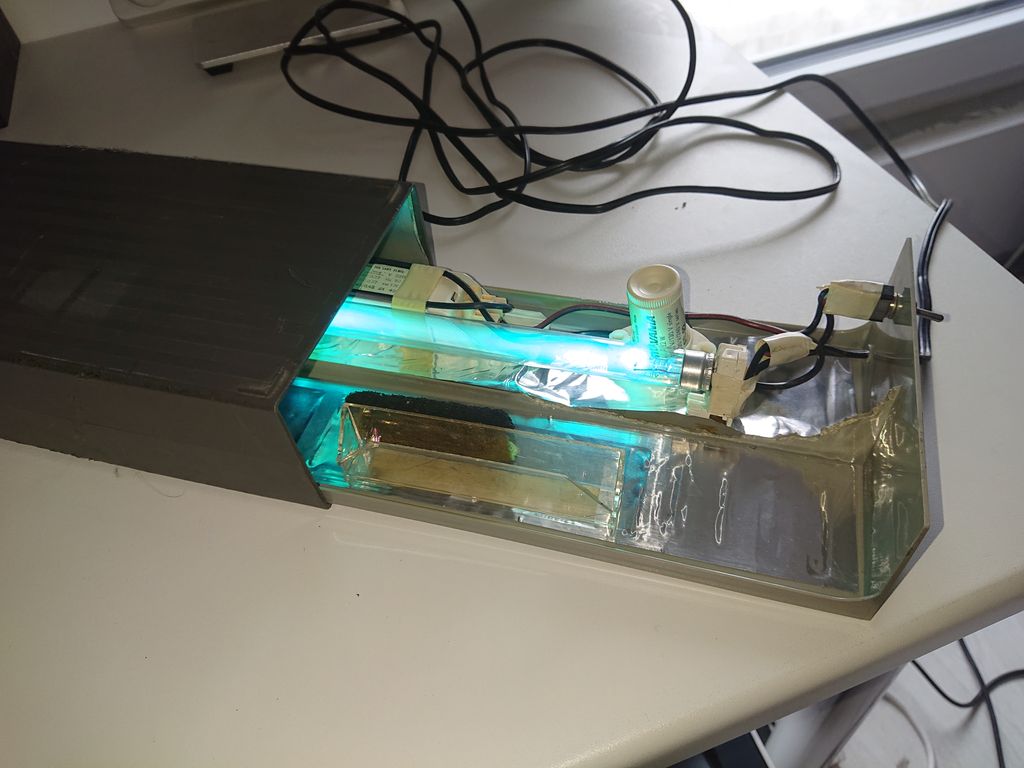 Bricolage dans une boite pour diapositive avec un transfo ballast et un starter de récup. Seul le tube avait été acheté.